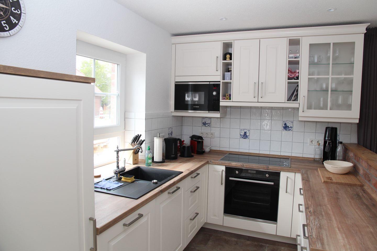 Schon die im Landhausstil eingerichtete Küche lässt keine Wünsche offen: Sie bietet einen großen Induktionsherd mit Backofen, Mikrowelle, ausreichende Arbeitsflächen, Kühl- und Gefrierschrank, Spülmaschine, Filter- und Nespresso-Kaffeemaschinen, Toaster, Wasserkocher sowie hochwertige Geschirr-, Gläser- und Bestecksortimente.