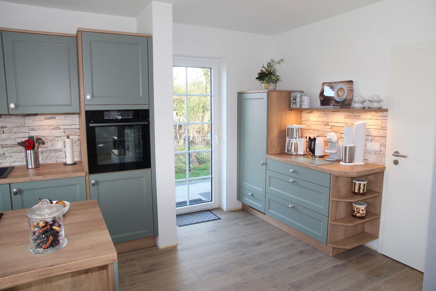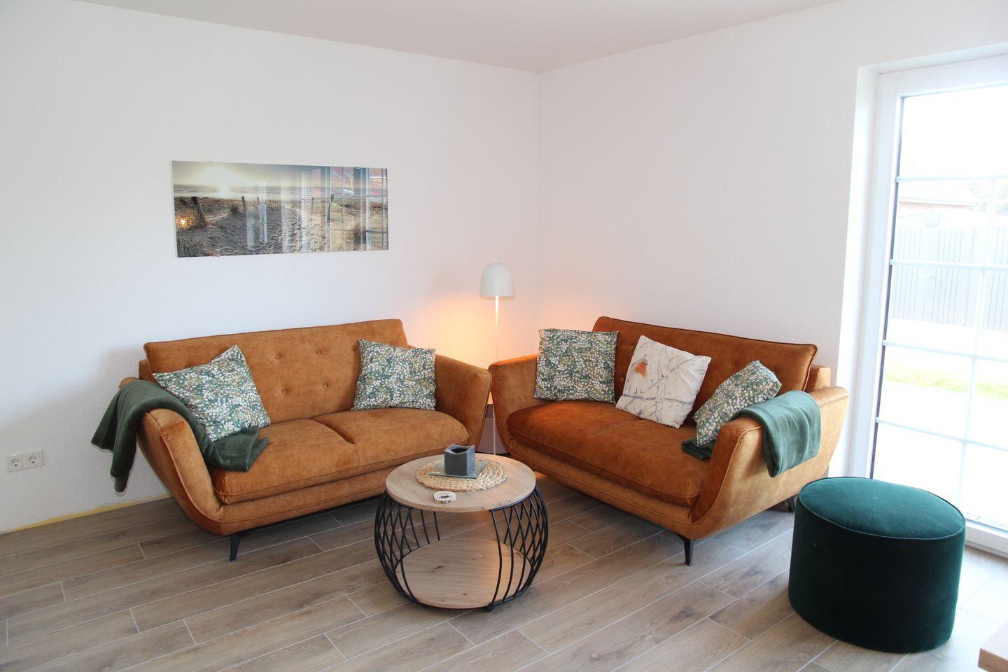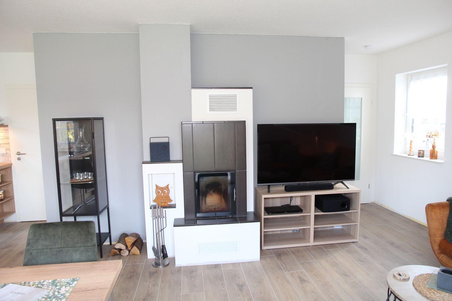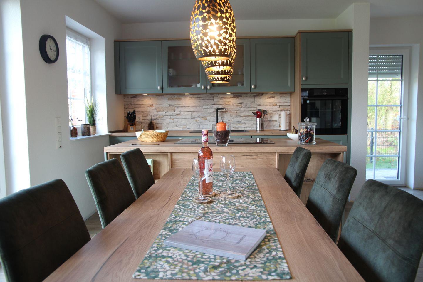 Dieses wunderschöne und hochwertig eingerichtete Haus überzeugt auf 100qm mit vielen Annehmlichkeiten: Durch den Eingangsbereich und Flur kommen Sie direkt in den Wohn-/Essbereich mit 6 Stühlen und Esstisch, sowie zwei großzügigen Sofas. Der Essbereich geht in die große und helle Küche über. In der Küche finden Sie alle notwendigen Geräte und Ausstattungsmerkmale für Ihren Urlaub: Kühlschrank mit Gefrierfach, Induktionskochfeld, Backofen, Kaffeemaschine, SodaStream, Wasserkocher, Toaster, Raclette-Gerät, Nescafé Dolce Gusto, Spülmaschine, Backutensilien etc. Auch ein großer Flachbildfernseher sowie eine Sound Box, ein Blue-Ray Player und ein schöner Kaminofen sind hier vorhanden. Von hier aus können Sie auch auf die möblierte Terrasse mit angrenzendem Garten hinaustreten, der auch eingezäunt ist.