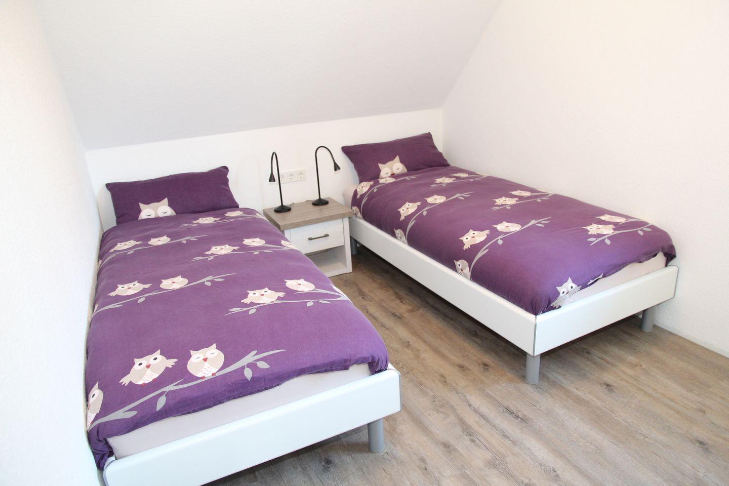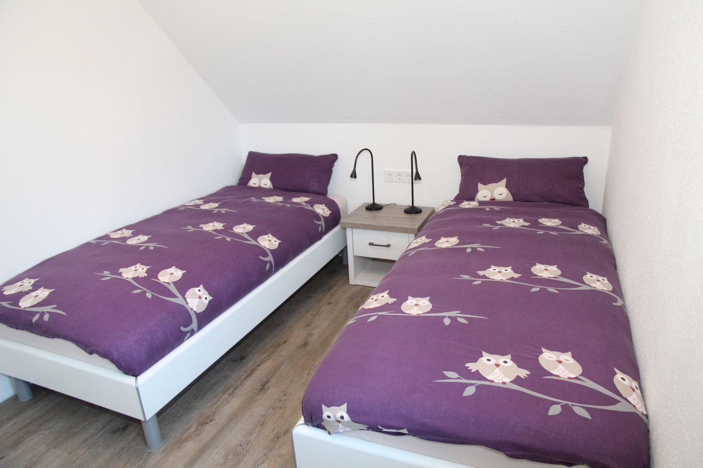 Im Obergeschoss finden Sie zwei weitere Schlafzimmer: Ein Schlafzimmer bietet ein weiteres Doppelbett mit Sessel, Kleiderschrank und Flachbildfernseher, in dem anderen Zimmer finden Sie zwei Einzelbetten und eine Kommode. Auch im Obergeschoss befindet sich noch ein Badezimmer mit ebenerdiger Dusche, Waschmaschine und Trockner. Aus den Dachfenstern im Obergeschoss hat man einen schönen Blick auf den Deich!