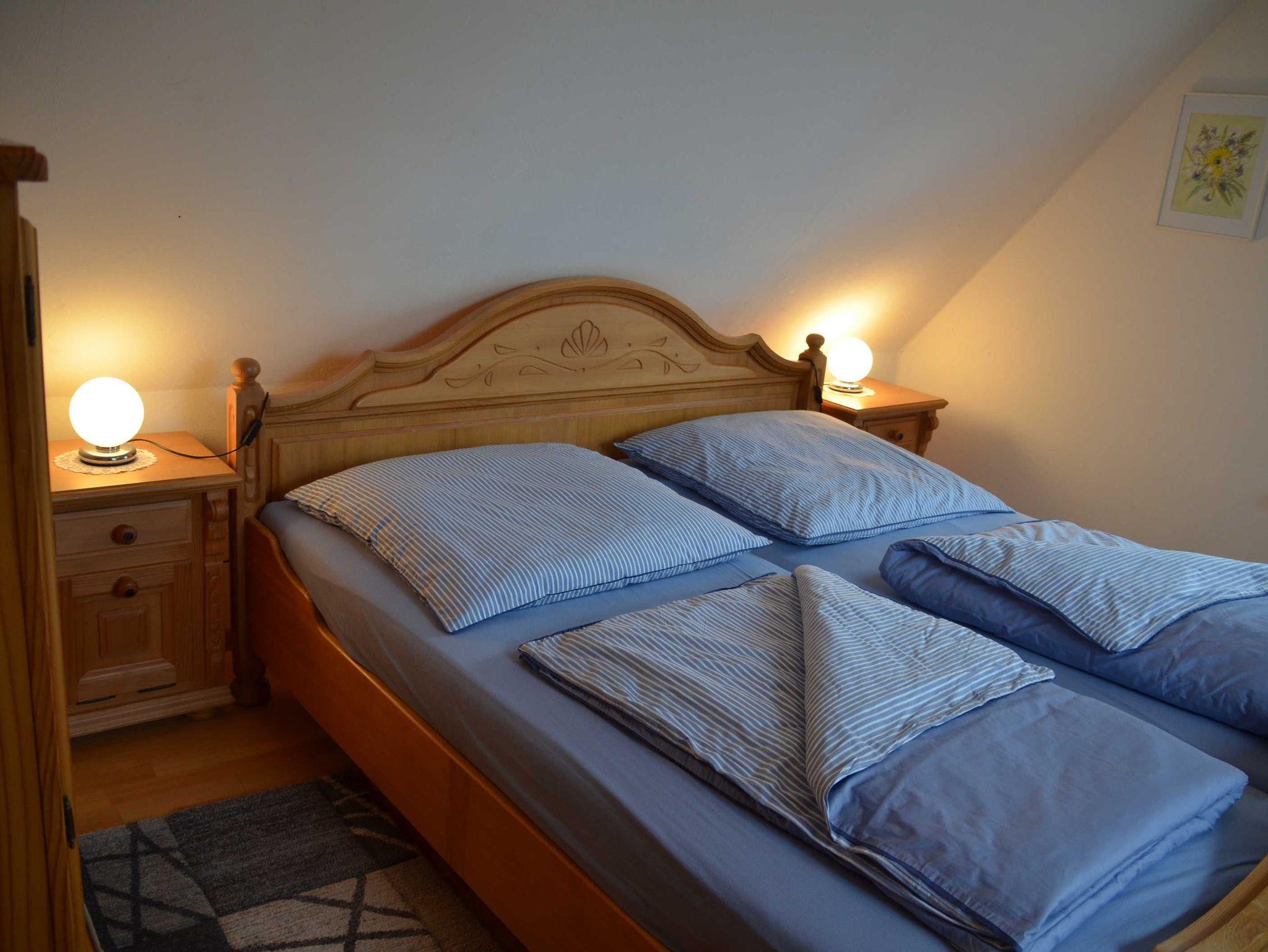 Im Obergeschoss befinden sich die beiden behaglichen Schlafräume (ein Doppelbett und zwei Einzelbetten) sowie ein Badezimmer mit Dusche. Ein Babybett steht für unsere kleinsten Gäste bereit. Für den praktischen Komfort sorgt der im Haus gelegene Waschraum mit Waschmaschine und Trockner. Dieser Raum ist zudem abschließbar und bietet Ihnen die Möglichkeit, Fahrräder sicher unterzustellen. Ein eigener Stellplatz gehört selbstverständlich zur Wohnung dazu.