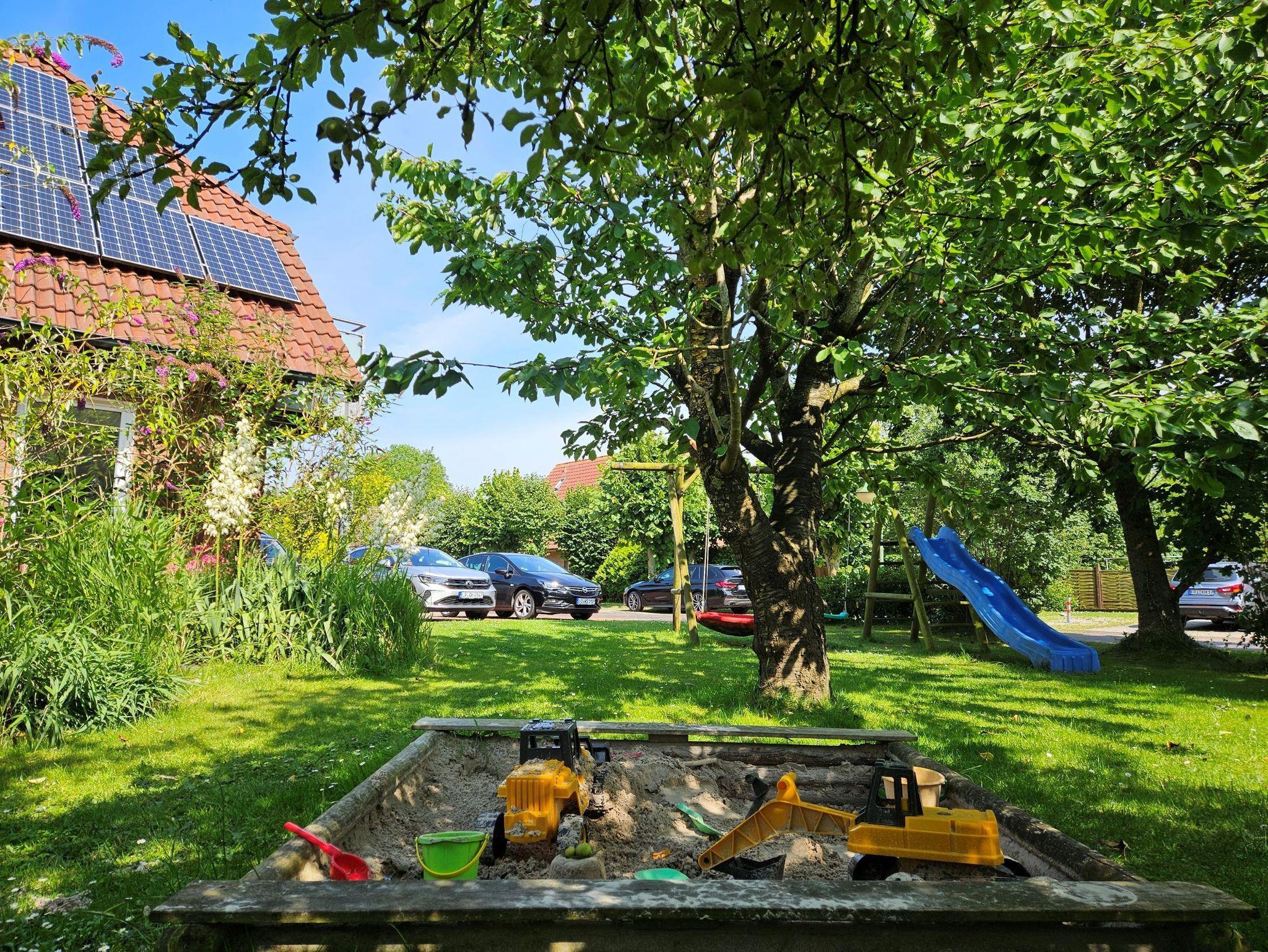 Der große Garten mit vielen Apfelbäumen sowie zwei Schaukeln, einer Rutsche, einem Sandkasten, einem Trampolin und einer Tischtennisplatte (Schläger finden sich im Haus) steht zur Benutzung zur Verfügung.Weiterhn finden Sie dort Sitz- und Liegemöglichkeiten.