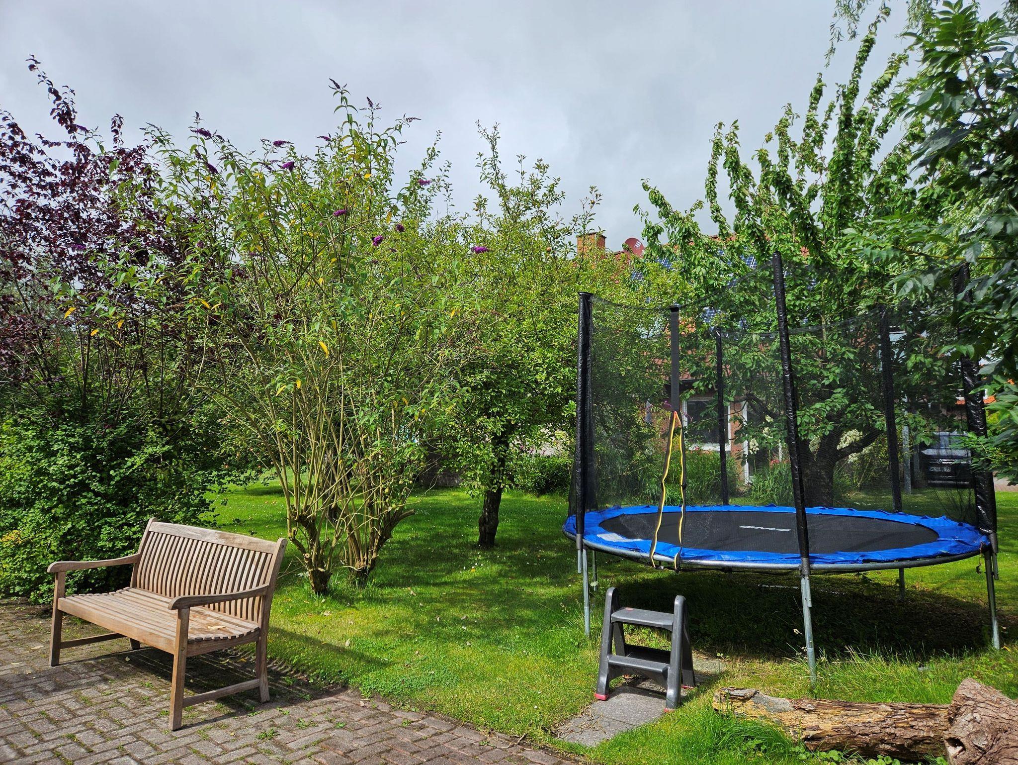 Zum Haus gehört ein Garten, in dem Sitz- und Liegemöglichkeiten, eine Tischtennisplatte sowie verschiedene Spielgeräte für Kinder, wie z. B. ein Trampolin bereit stehen.