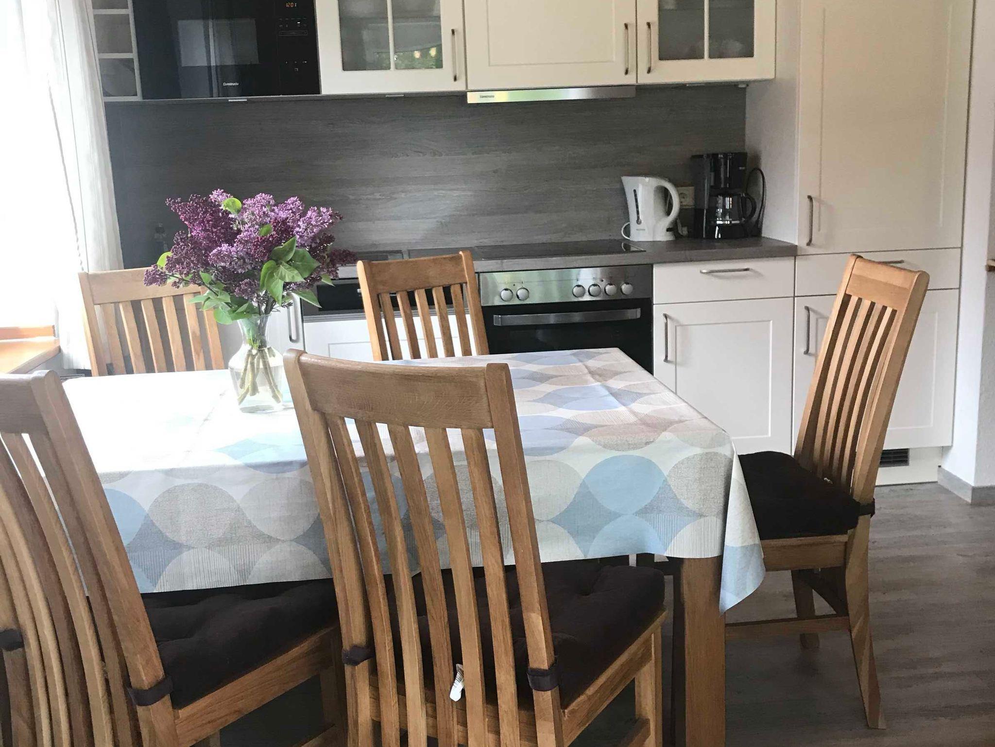 Haus Deichblick 1 ist ausgestattet im Erdgeschoss mit einem Schlafraum mit Doppelbett, einem Bad mit Dusche und einem Wohnraum mit Essbereich und Küchenbereich.