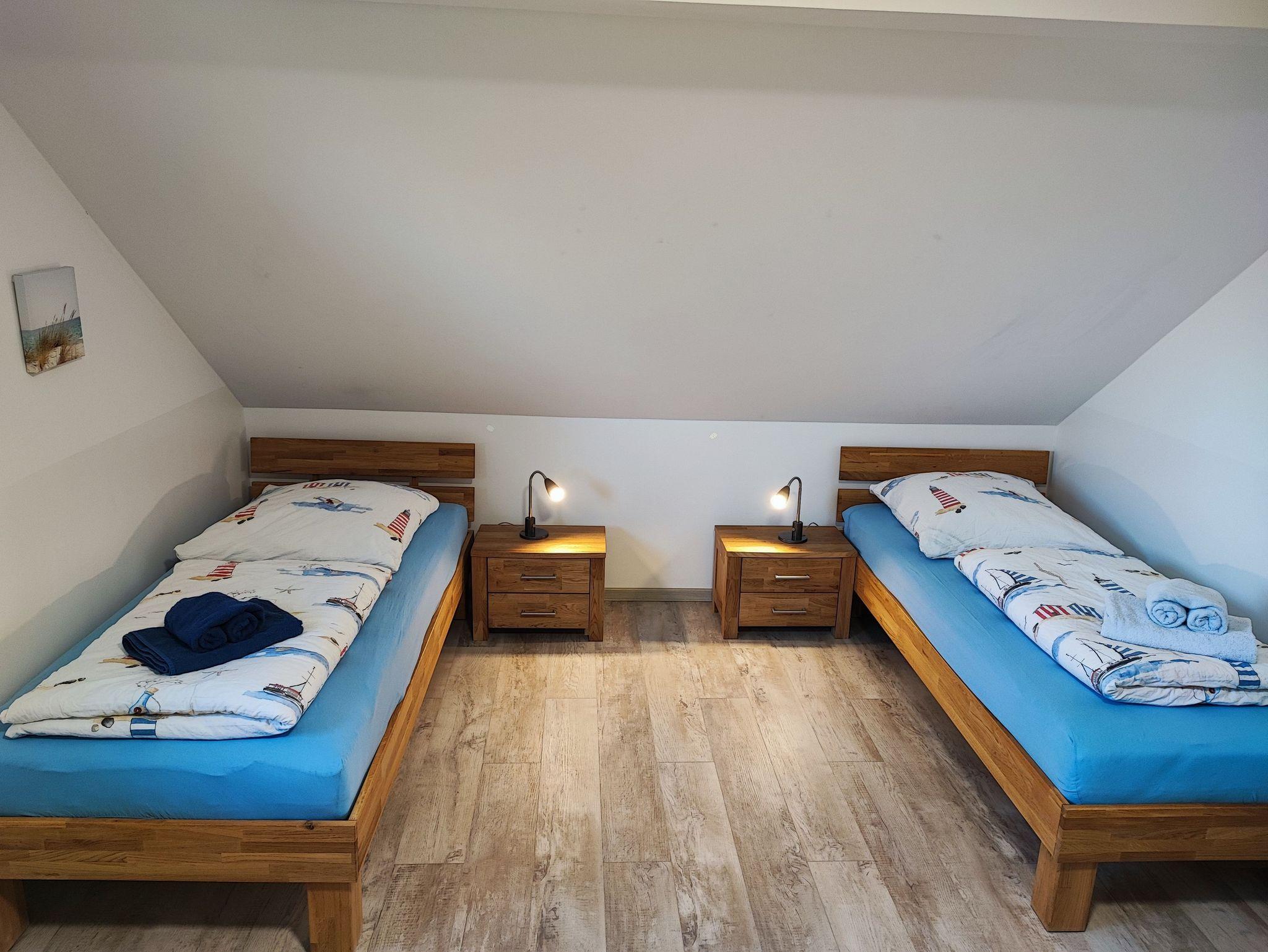 Im 1. Obergeschoss befinden sich 2 Schlafräume, ein Schlafraum ist mit 2 Einzelbetten und der andere Schlafraum mit einem Doppelbett ausgestattet. Außerdem befindet sich ein Gäste WC im 1.OG.