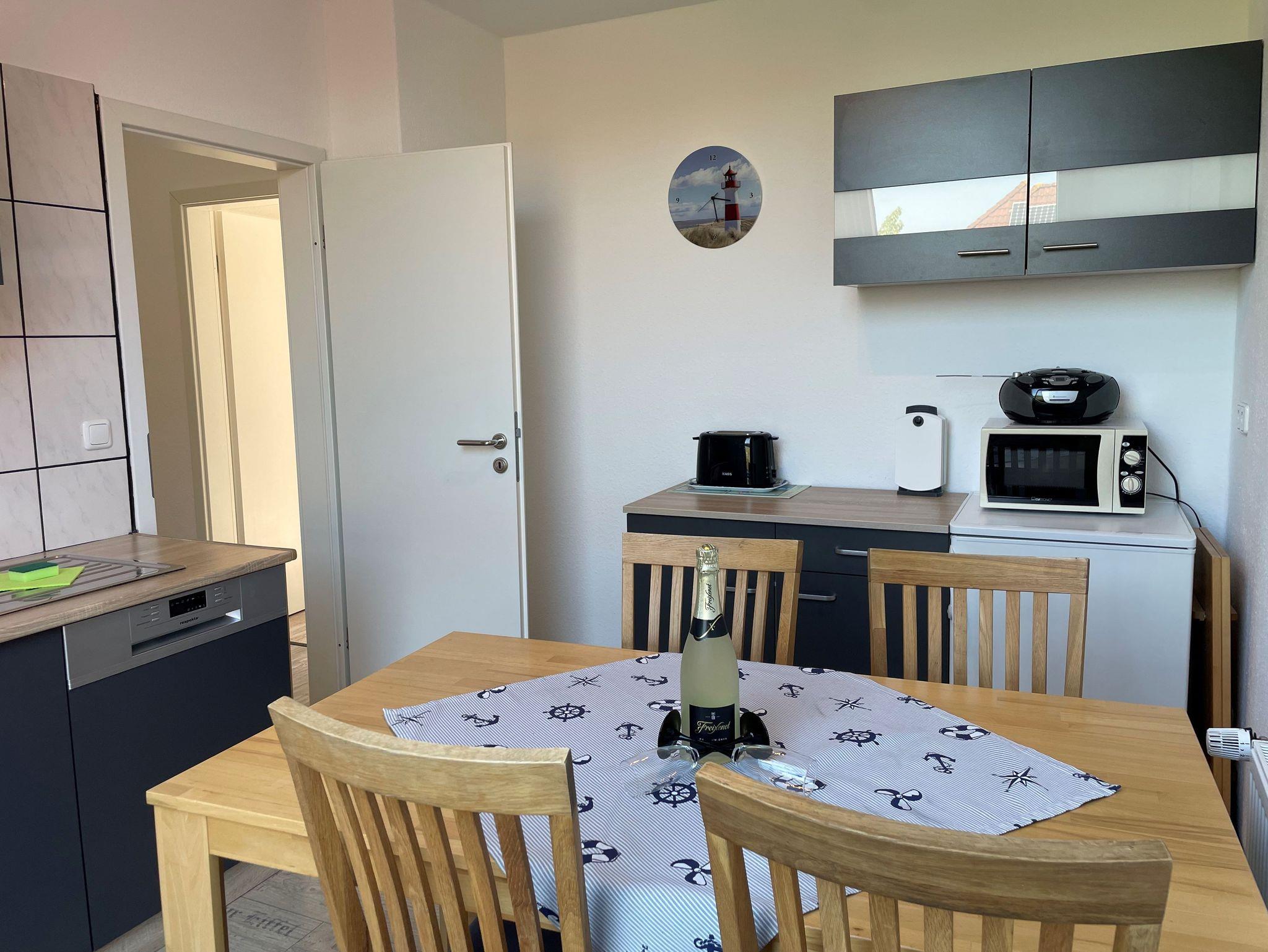 Die Obergeschoßwohnung Spiekeroog verfügt über einen gemütlichen Wohnraum, eine separate, lichtdurchflutete Küche, ein Bad mit Tageslicht und zwei Schlafräume. Sie ist mit Fliesen- und Laminatböden ausgestattet und verfügt über einen großen Flachbild-Fernseher, einen Blu-ray-Player und WLAN. In der Küche steht alles für Ihre Selbstversorgung zur Verfügung: Geschirrspüler, Backofen, Wasserkocher, Mikrowelle sowie Kühlschrank mit Eisfach.