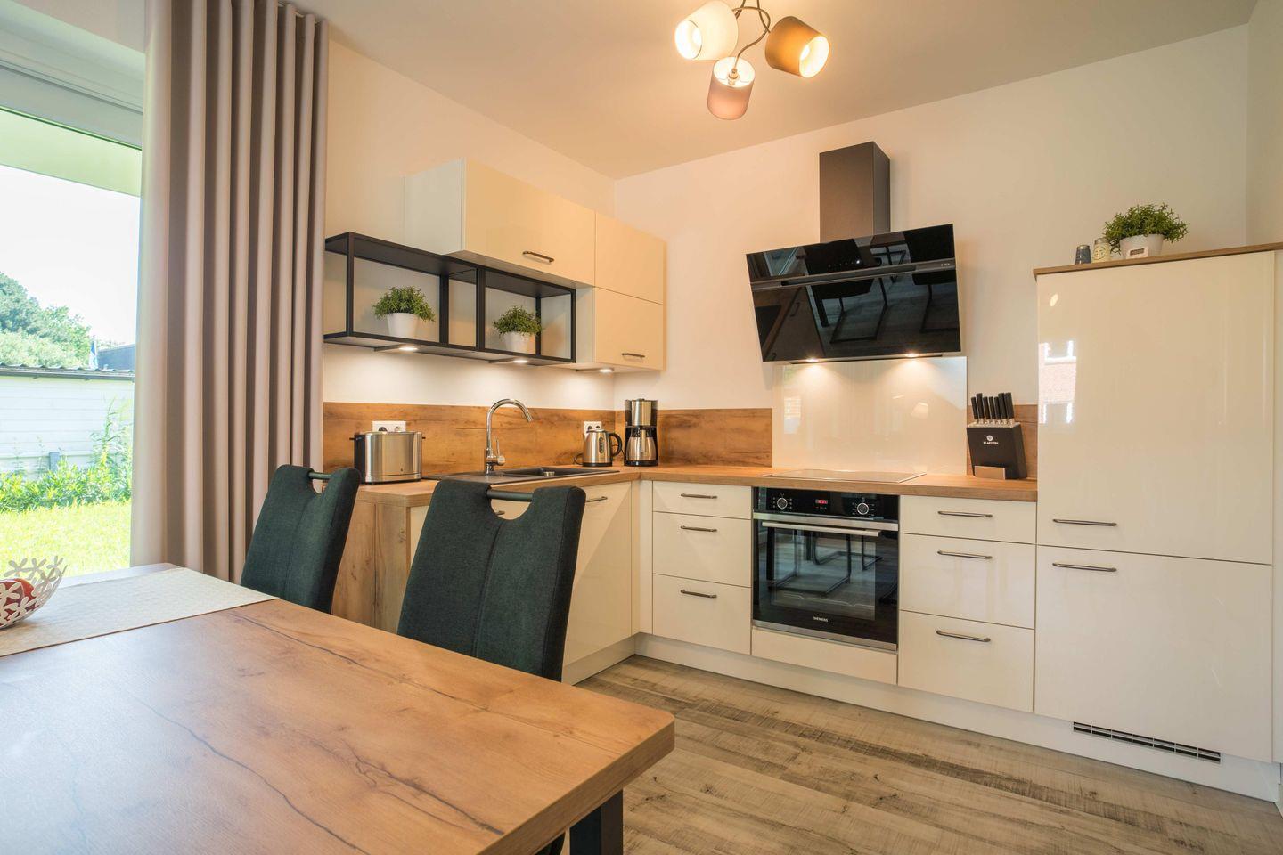 Wenn Sie sich selbst versorgen möchten, steht Ihnen eine hochwertig ausgestattete Einbauküche zur Verfügung. Ein besonderes Highlight der Ferienwohnung ist der Elektrowandkamin für kühlere Tage sowie die Infrarotkabine, in der Sie nach einem langen Spaziergang herrlich entspannen können.