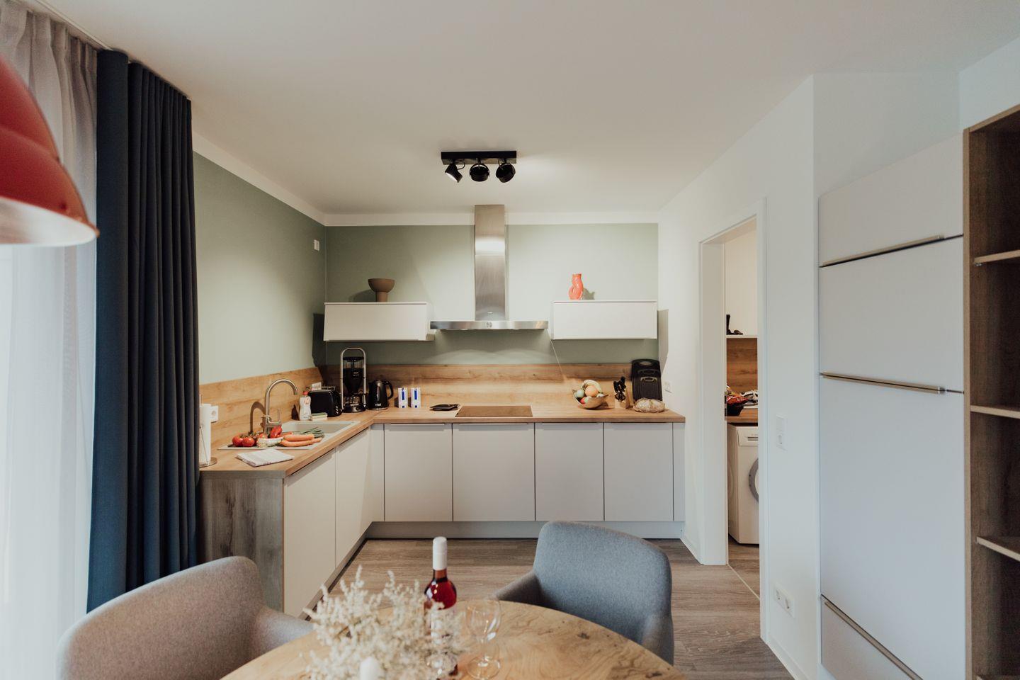 Der geräumige Wohn- und Essbereich lädt zum gemeinsamen Entspannen oder geselligen Spieleabenden ein, während die hochwertige Küche über viele Extras für die Zubereitung leckerer Speisen verfügt. Das Besondere an dieser Ferienwohnung ist die exklusive Wellness-Ausstattung mit integrierter Infrarot-Wärmekabine und modernem Badezimmer. Ein eigener Strandkorb auf dem Balkon, ein sicherer Zimmersafe sowie ein abschließbarer Fahrradraum mit 220 Volt Ladeanschluss für E-Bikes sind weitere Ausstattungshighlights.