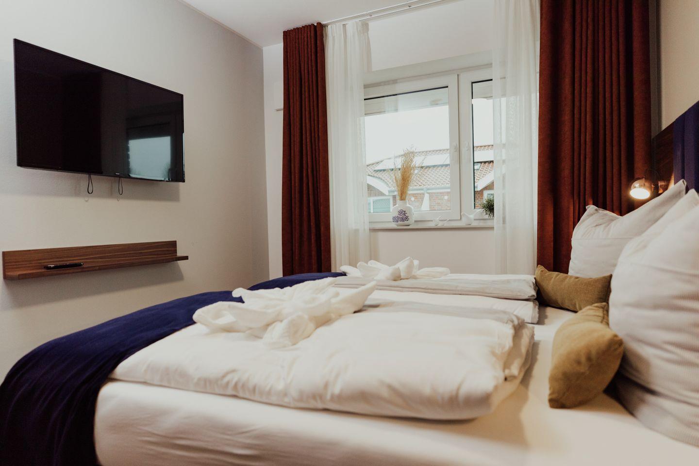 Das exklusive Penthouse "Haubentaucher" mit 18 m² Dachterrasse mit einem Abstellraum und Strandkorb lädt zu Sonnenbädern ein. Das 73 m² Apartment bietet zwei geräumige Schlafzimmer, einen offenen Wohn- und Essbereich, eine voll ausgestattete Küche und ein hochwertiges Badezimmer. Die moderne Ausstattung umfasst eine Küche mit zahlreichen Extras, eine geschmackvolle Einrichtung und eine Infrarot-Wärmekabine für Wellnessmomente.