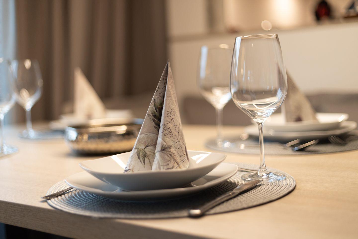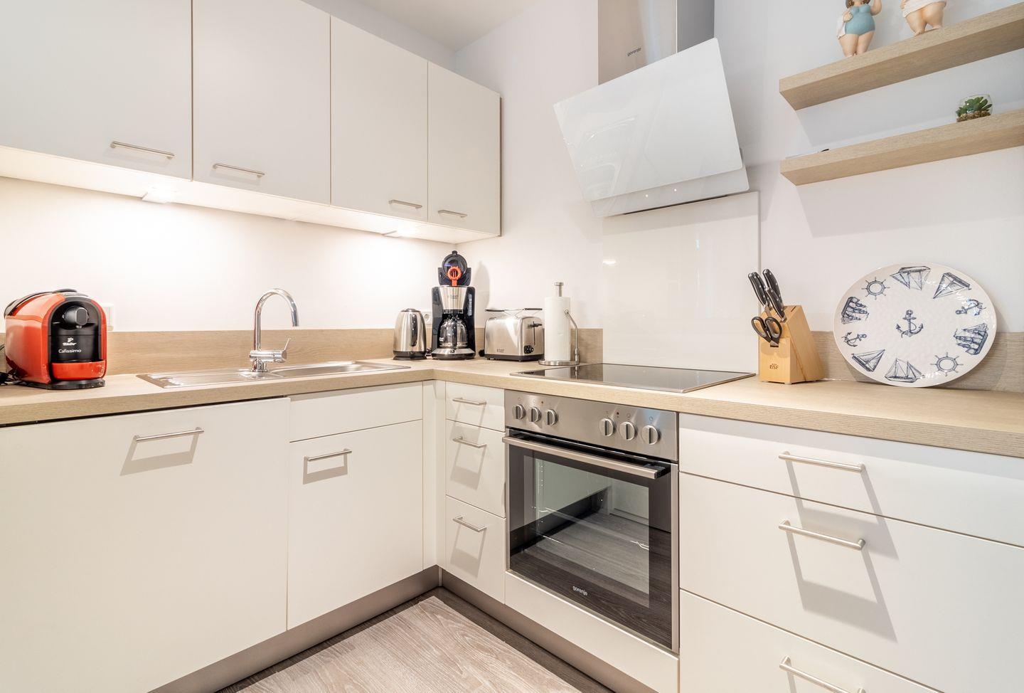 Die offene Küche ist mit modernen Geräten ausgestattet und bietet alles, was Sie für eine Selbstversorgung benötigen: Ein Ceranherd, Backofen, Kühlschrank mit integriertem Gefrierfach, Spülmaschine, Mikrowelle, Kaffeemaschine, Wasserkocher, Mixer, Eierkocher und ausreichend Geschirr und Besteck gehören zur Grundausstattung. Auch ein Elektrogrill steht Ihnen zur Verfügung. Für höchsten Komfort sorgen außerdem eine Waschmaschine, ein Wäscheständer, Bügelbrett und Bügeleisen.