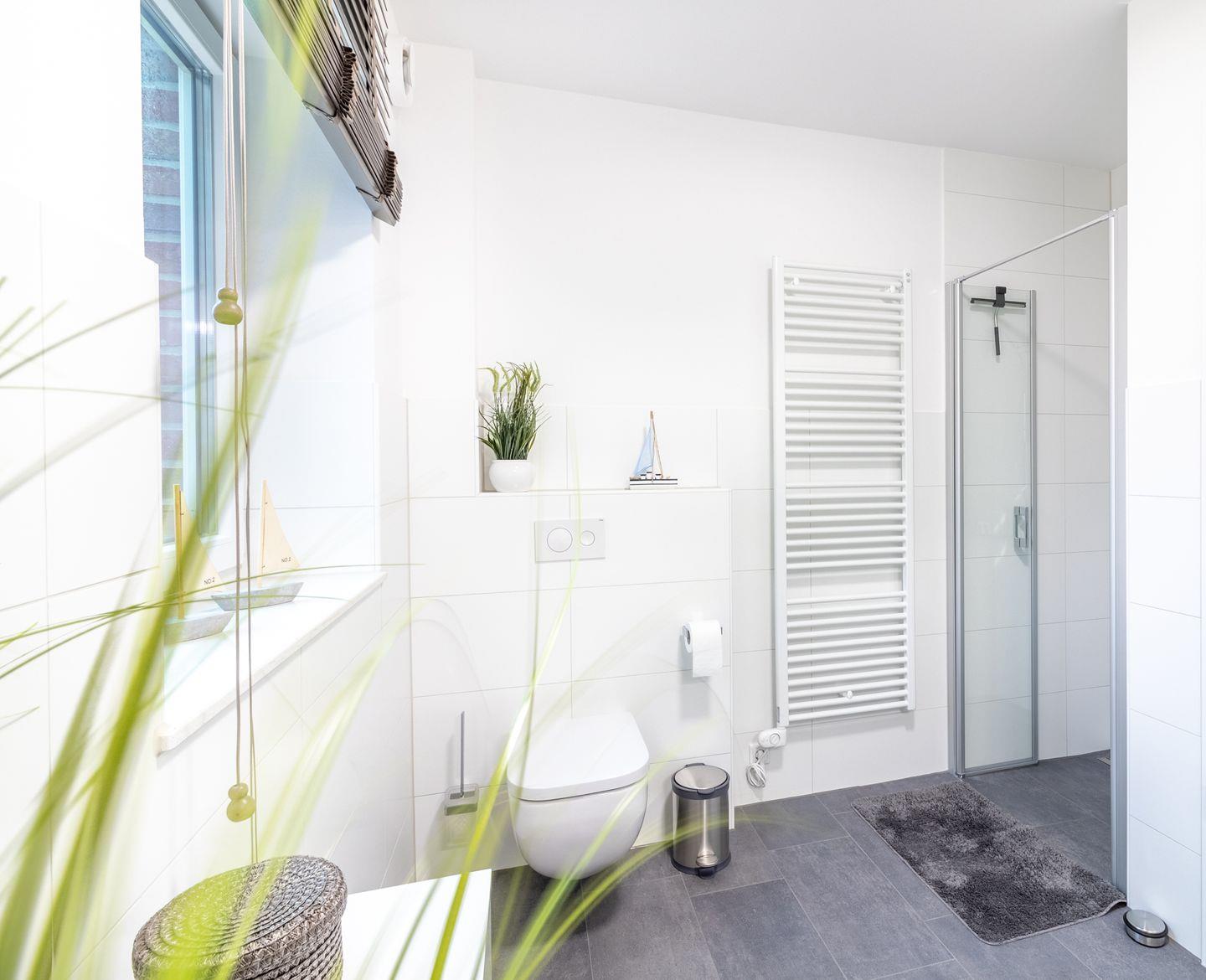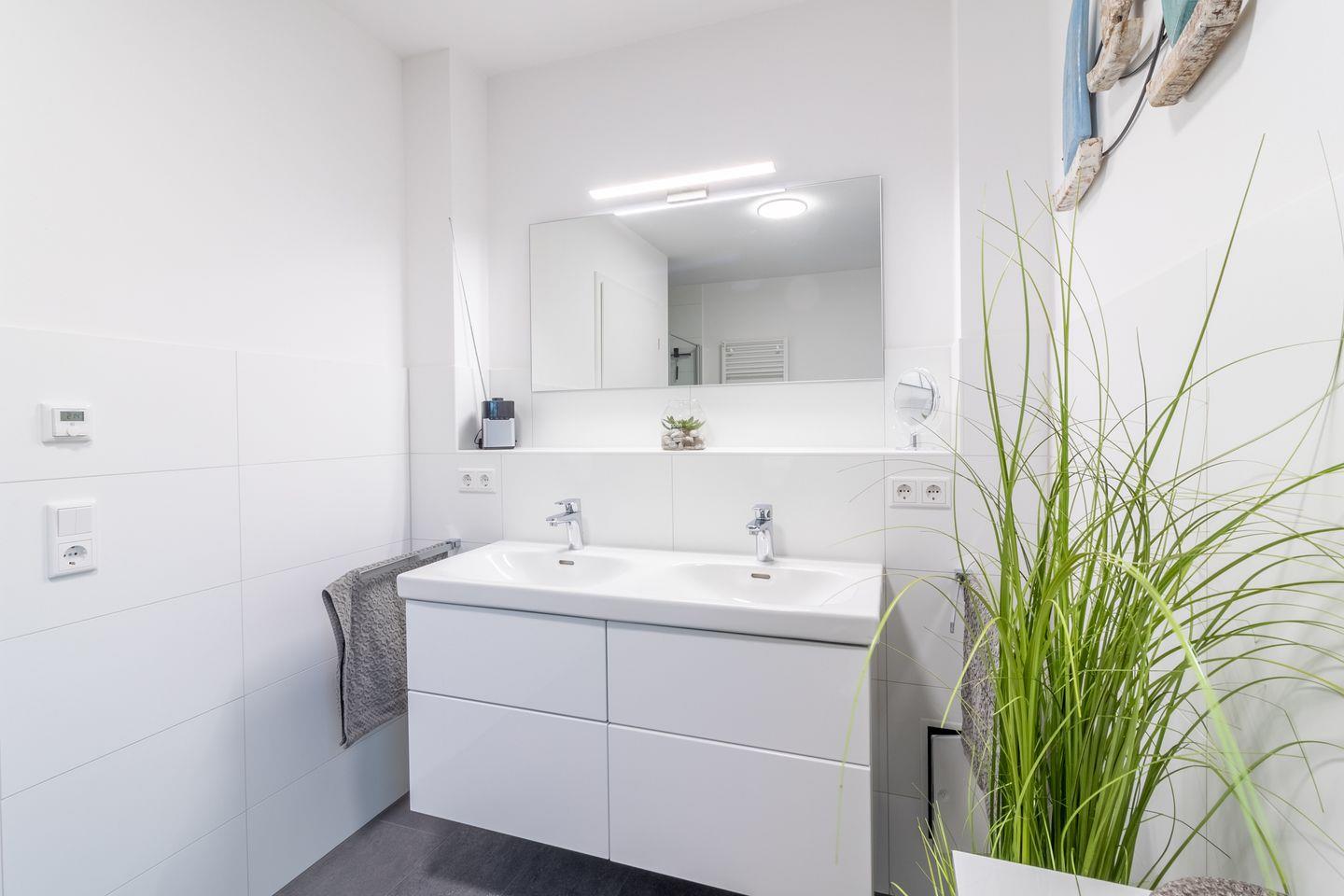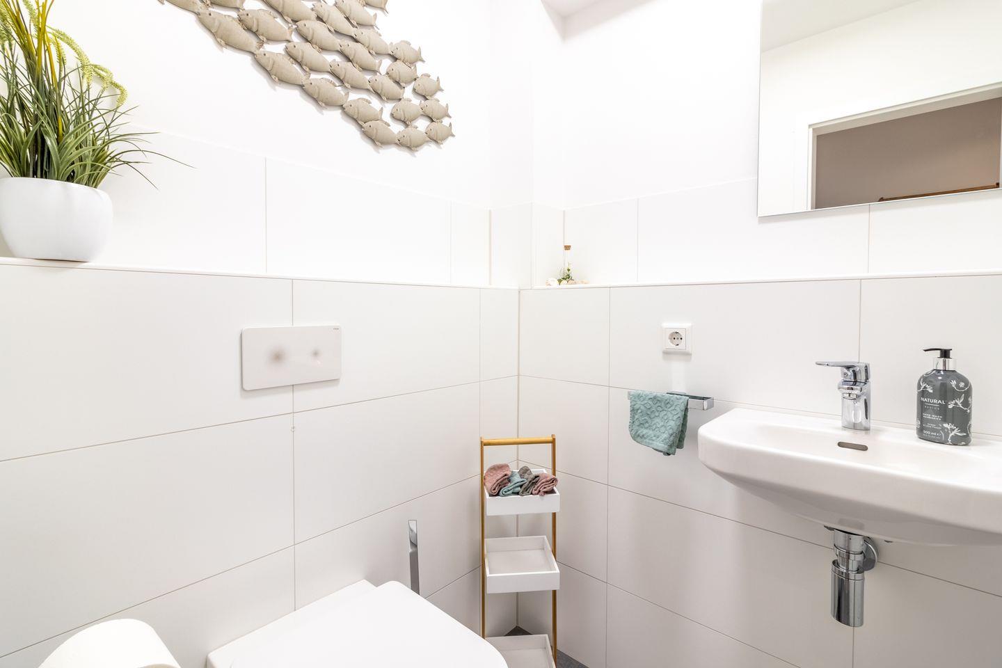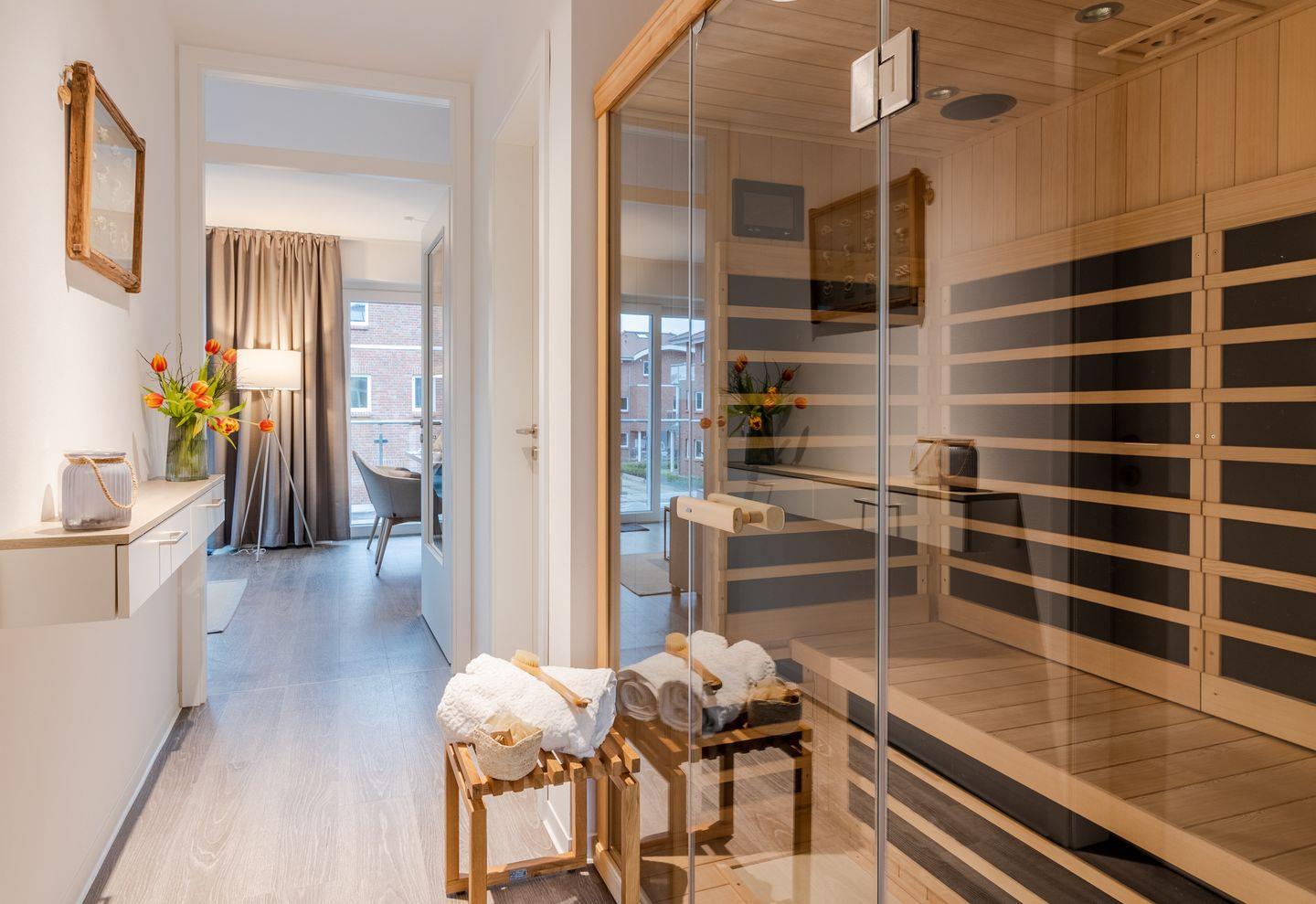 Im Badezimmer finden Sie eine moderne Dusche mit Badewanne sowie einen Haartrockner und Kosmetikspiegel. Zusätzlich steht Ihnen ein separates Gäste-WC zur Verfügung. Die Infrarotkabine bietet nach einem ausgiebigen Strandspaziergang wohlige Entspannung.