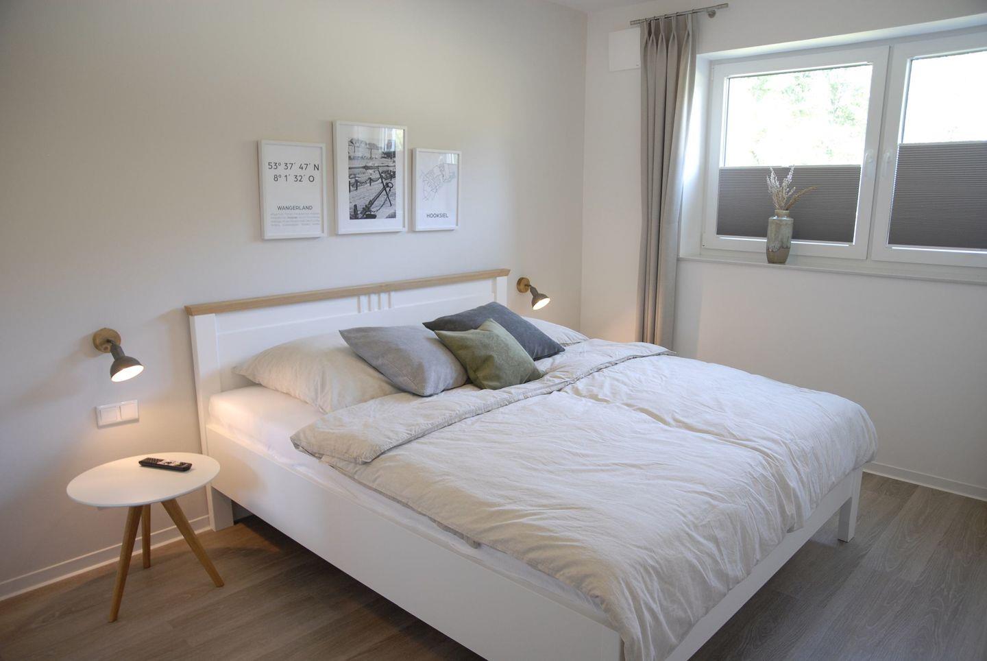 In einem Schlafzimmer befindet sich ein Doppelbett mit einer Liegefläche von 180x200 cm und ein 3-türiger Kleiderschrank sowie ein TV-Gerät. Das zweite Schlafzimmer ist mit 2 Einzelbetten mit einer Liegefläche von je 90x200 cm bestückt, außerdem mit einem 1-türigen Kleiderschrank, einer Schubkastenkommode und einem TV-Gerät. Die hochwertigen Matratzen sind aus dem Hause Musterring. Zusätzlich zum Badezimmer mit Doppelwaschtisch, Dusche und Toilette verfügt die Wohnung über ein Gäste-WC. Außerdem nutzen Sie kostenlos eine Infrarot-Wärmekabine und eine E-Ladesäule gg. Gebühr.