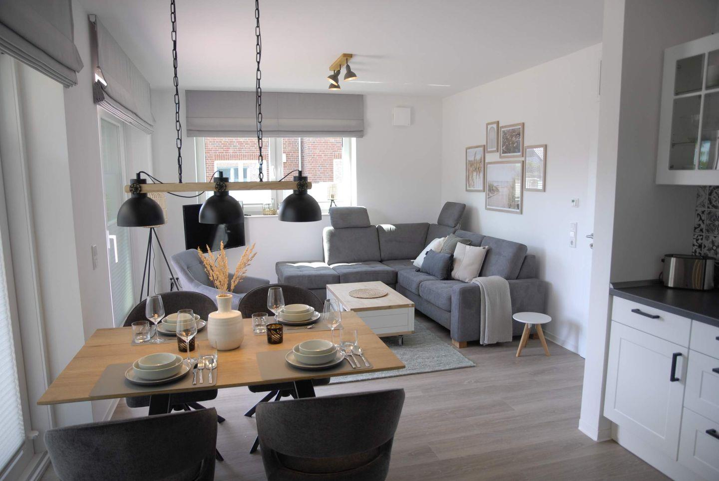 Unsere Ferienwohnung befindet sich im Haus Juist mit fünf weiteren Wohnungen, die alle im gleichen modernen Landhausstil mit Liebe eingerichtet wurden. Die Wohnfläche beträgt ca. 82 m² und befindet sich im Erdgeschoss.