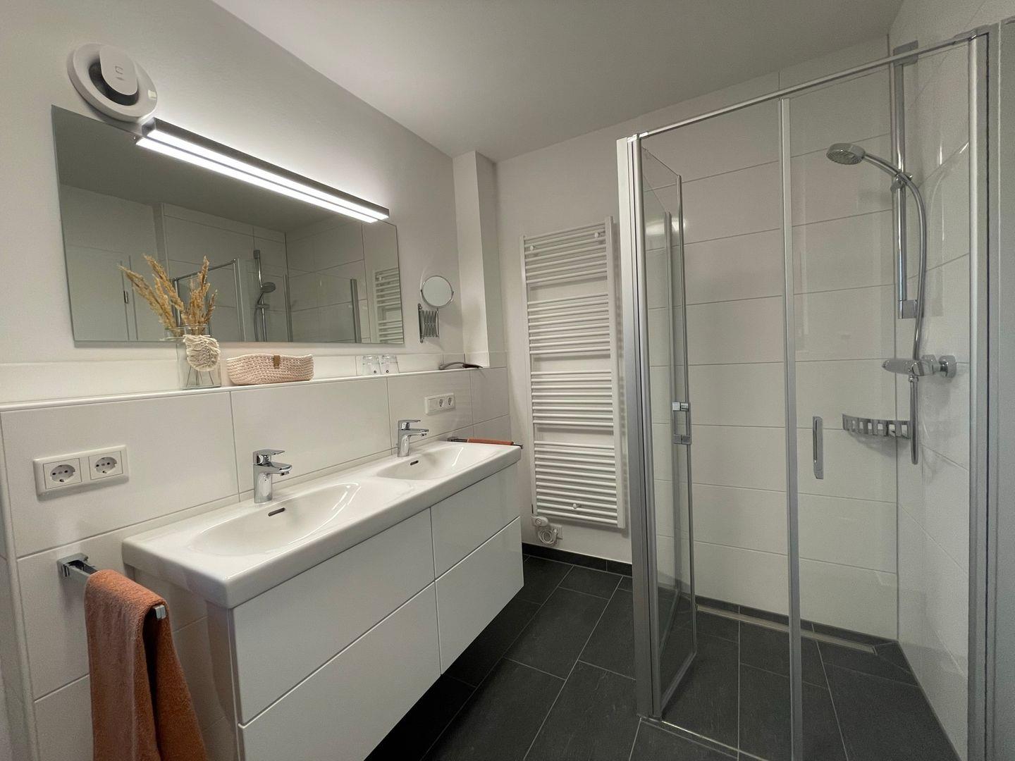 Das Badezimmer beeindruckt mit Doppelwaschtisch, Dusche und Toilette sowie einer Infrarot-Wärmekabine, die Sie kostenfrei nutzen können. Zusätzlich bieten wir Ihnen nach Absprache die kostenlose Ladestation für Ihr Hybrid- oder E-Auto während Ihres Aufenthalts.