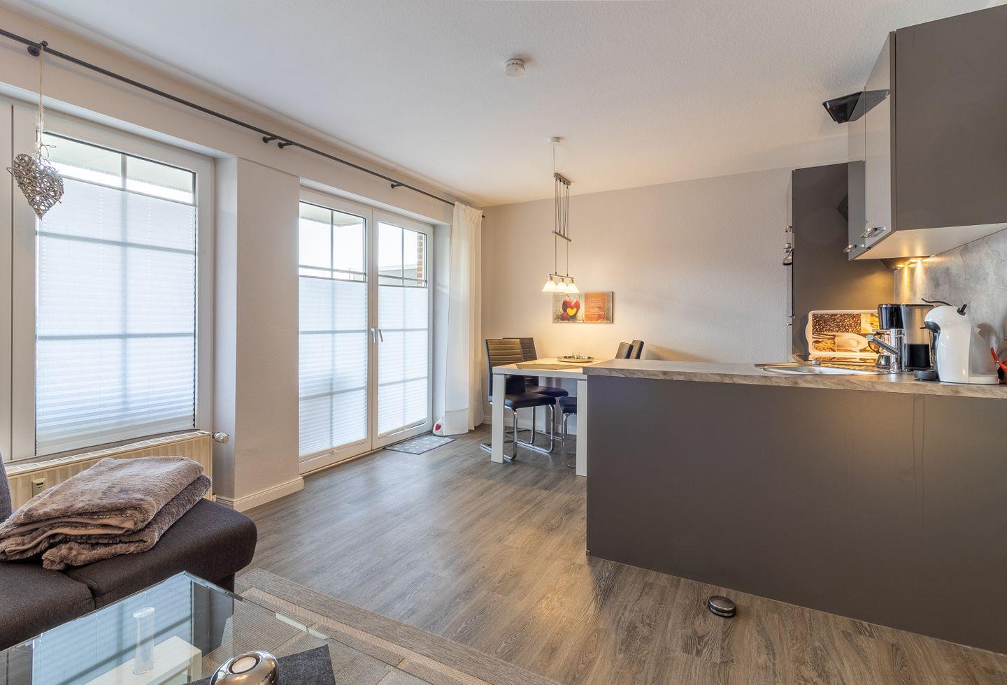 Moderne Ferienwohnung Ebbe in Hooksiel, gemütlich mit Terrasse, WLAN und Parkplatz für bis zu 4 Personen.
