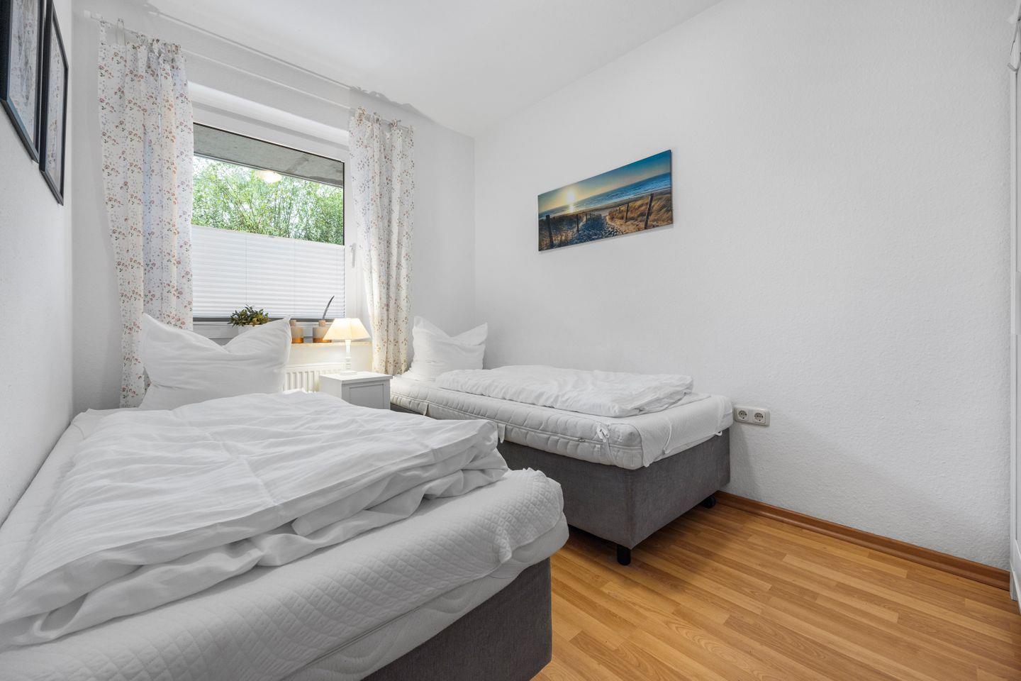 Das erste Schlafzimmer lädt mit einem komfortablen Doppelbett zum Entspannen ein, während das zweite Zimmer mit zwei Einzelbetten ausgestattet ist und zusätzlich ein Kinderreisebett sowie einen Kinderhochstuhl bereithält.