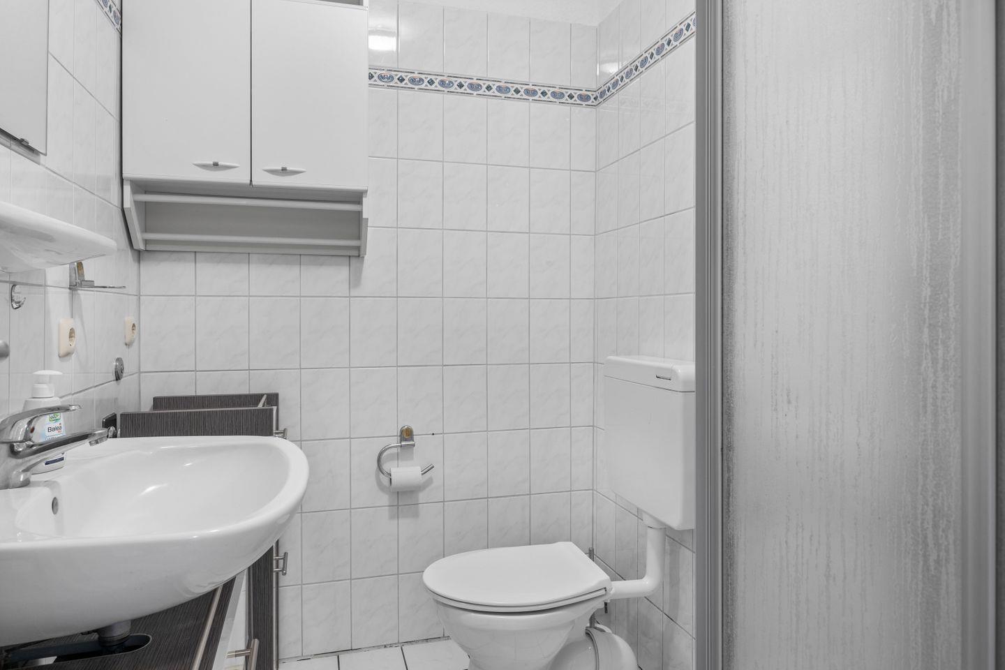 Das Badezimmer ist stilvoll eingerichtet und bietet eine erfrischende Dusche sowie eine praktische Toilette.