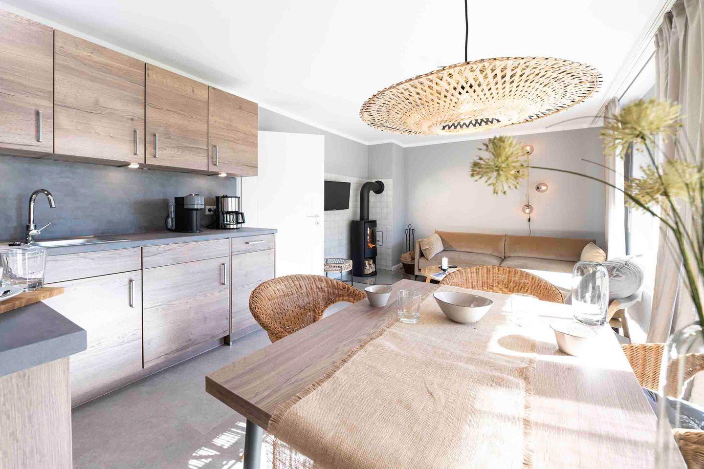 Die liebevoll renovierte 55 m² Ferienwohnung für bis zu 4 Personen bietet ein modernes Badezimmer mit ebenerdiger Dusche und eine voll ausgestattete Küche mit Nespresso-Maschine. Genießen Sie die nach Süden ausgerichtete Terrasse, das gemütliche Wohnzimmer mit Kaminofen und kostenloses WLAN. Fahrräder können im Gartenhäuschen untergestellt werden, und ein Strandkorb am Hooksieler Strand ist saisonal kostenfrei verfügbar.