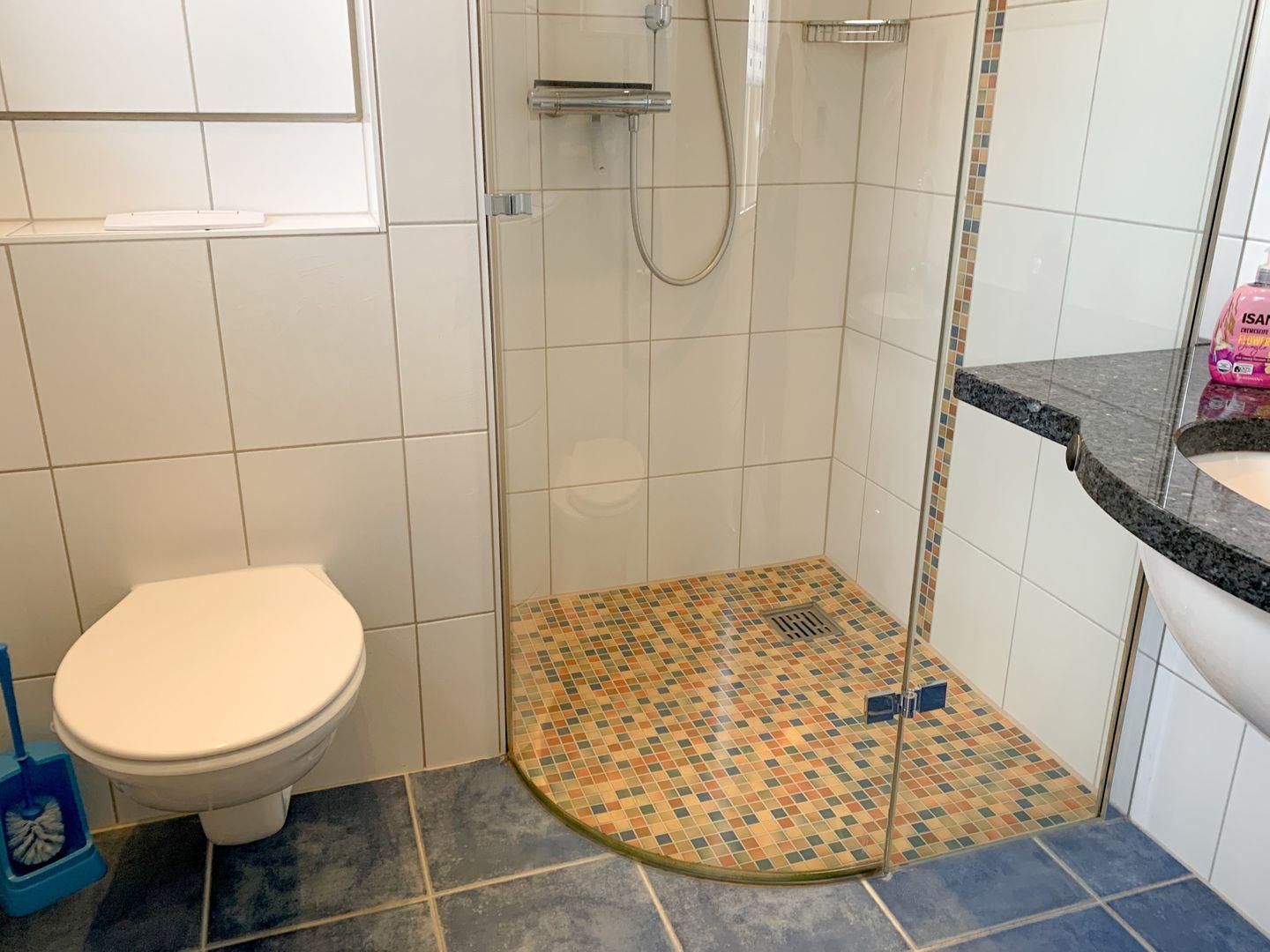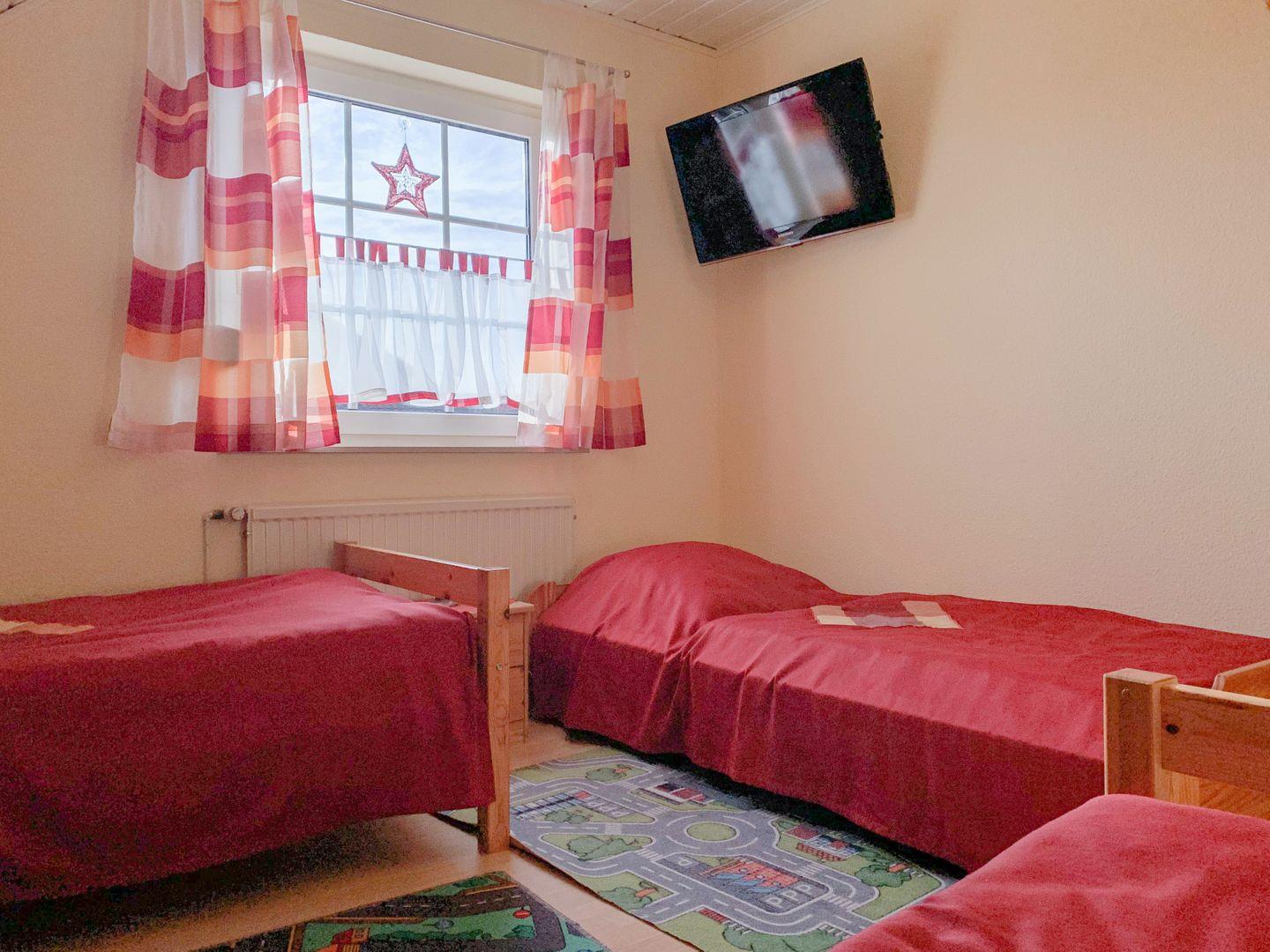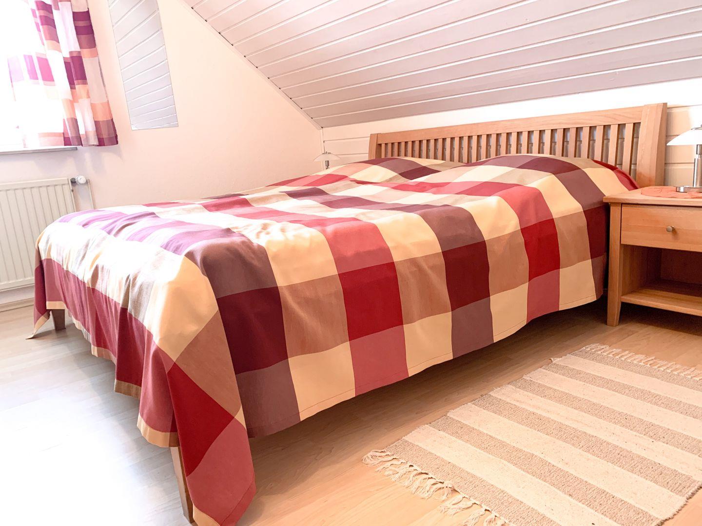 Über eine einladende Holztreppe erreichen Sie das Obergeschoss, wo Sie von zwei Schlafzimmern mit schönem Laminatboden empfangen werden. Ein Schlafzimmer verfügt über ein gemütliches Doppelbett und ein Kinderbett, während das andere Zimmer mit drei Einzelbetten ausgestattet ist, von denen zwei mühelos zu einem weiteren Doppelbett umgewandelt werden können. Ein zweites Badezimmer mit Dusche/WC, Waschmaschine und Trockner sorgt für zusätzlichen Komfort. Die charmante Dachgaube verleiht diesem Bad eine ganz besondere Atmosphäre.
