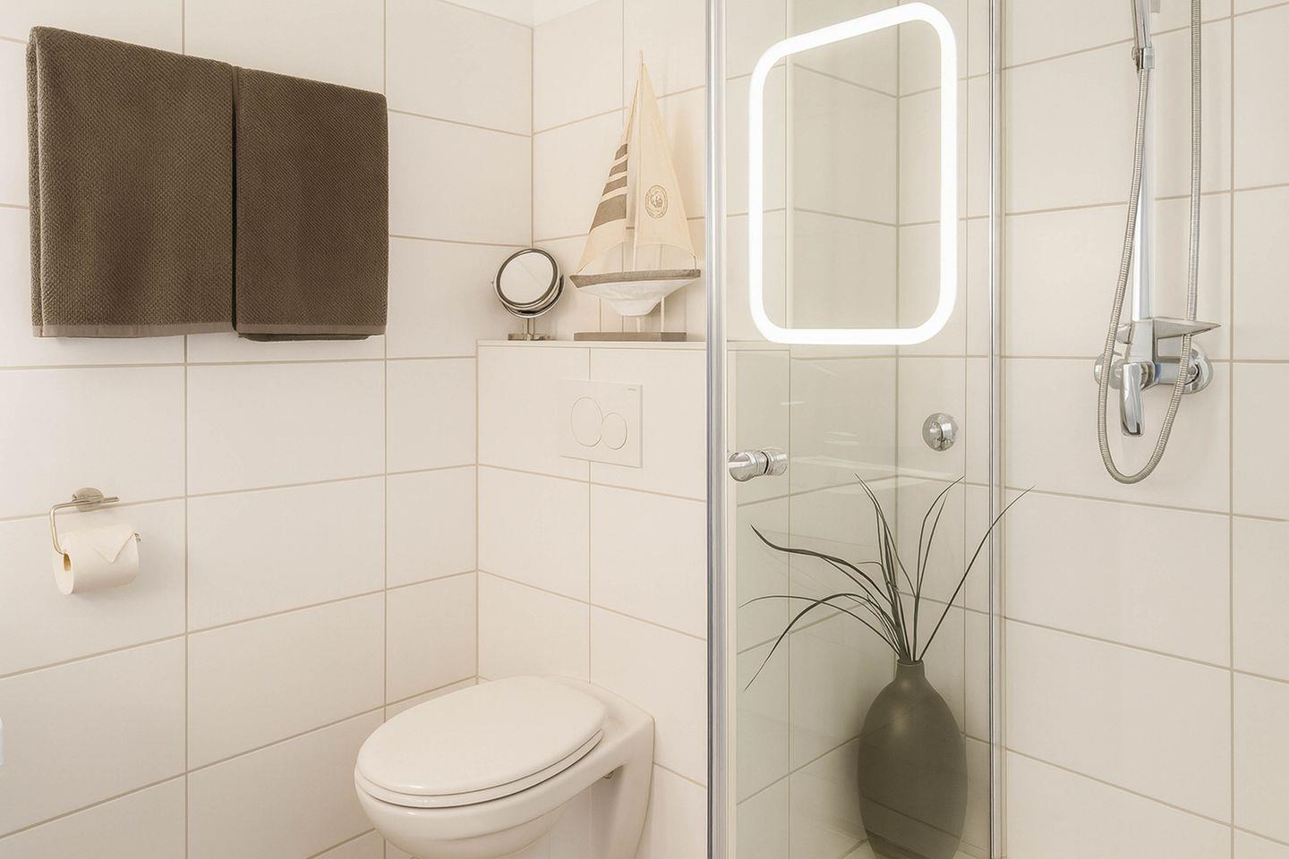 Das moderne Badezimmer überzeugt mit einer Dusche mit niedrigem Einstieg, einem stilvollen Waschtisch und WC und bietet damit Komfort für alle Altersgruppen.