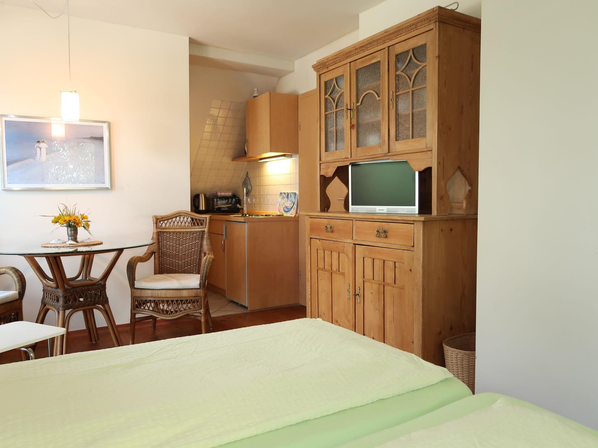 1-Zimmer-Wohnung 25 m2 im 1. Stock. Geschmackvoll eingerichtet: abgeschrägtes Wohn-/Schlafzimmer mit 1 Doppelbett, Esstisch, Sat-TV und Radio. Ausgang zur Terrasse. Kochnische (2 Kochplatten, Mini-Backofen, Toaster, Wasserkocher, elektrische Kaffeemaschine). Dusche/WC. Grosse Terrasse 10 m2, Gartensitzplatz. Terrassenmöbel, Liegestühle (2). Sehr schöne Fernsicht auf den Garten und die Landschaft. Zur Verfügung: Internet (Wireless LAN, gratis). Bitte beachten: Nichtraucher-Unterkunft. Rauchmelder. baubiologische Komplettsanierung, Allergikerfreundlich und Fliegengitter in allen Räumen vorhanden. Die ausgeschriebene Terrasse ist eine Dachterrasse.
