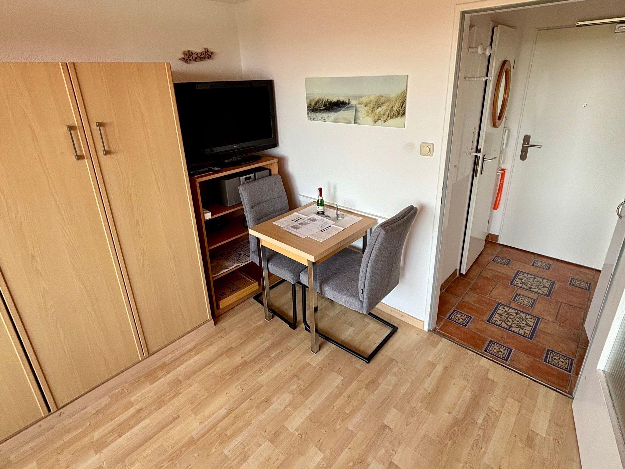 Die Wohnung bietet eine voll ausgestattete Küchenzeile mit Kühlschrank, zwei Kochplatten und einer Tassimo-Kaffeemaschine ? ideal für die Zubereitung kleiner Mahlzeiten und den ersten Kaffee am Morgen. Der gemütliche Essbereich verfügt über einen ausklappbaren Tisch für zwei Personen.