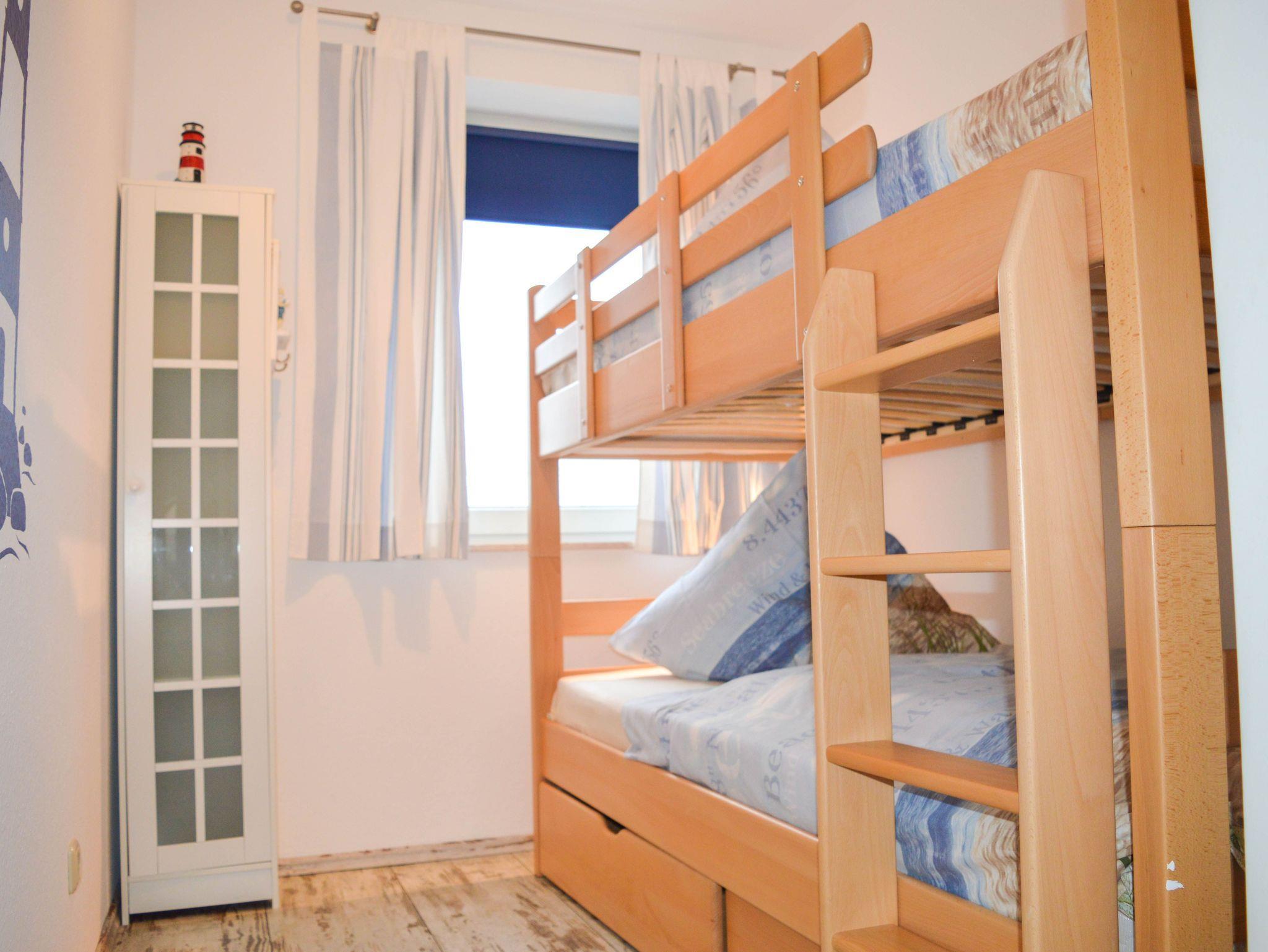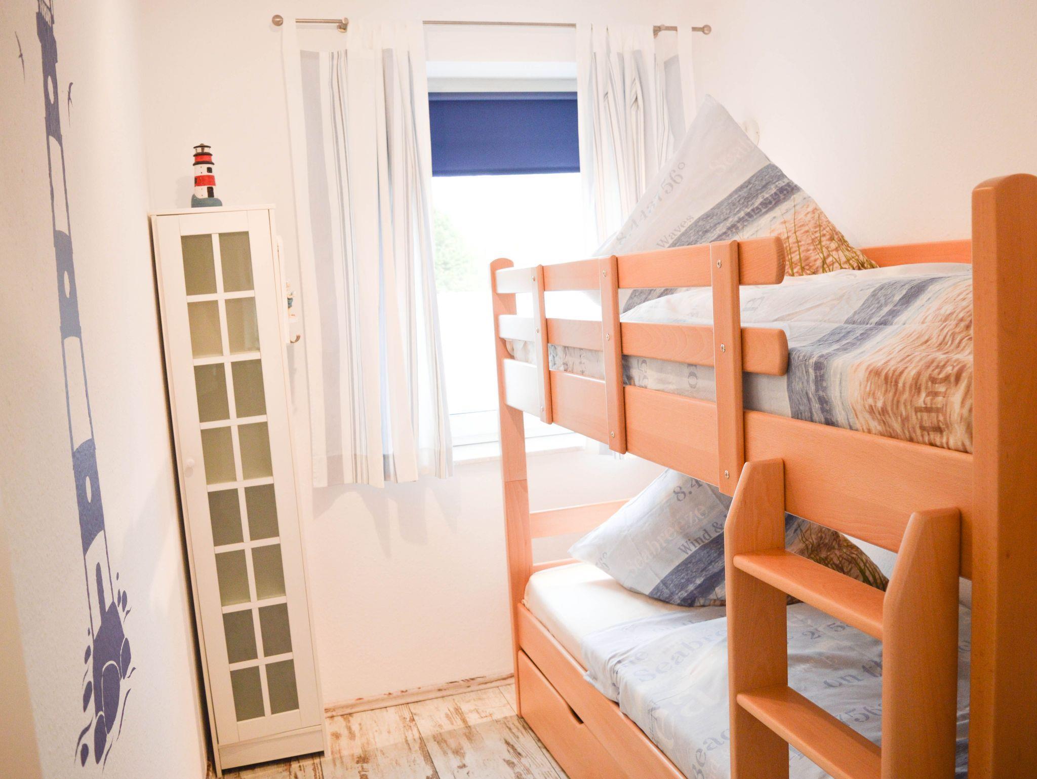 Ein Schlafzimmer mit Doppelbett sowie ein separates Kinderzimmer mit Etagenbett sorgen für erholsame Nächte.