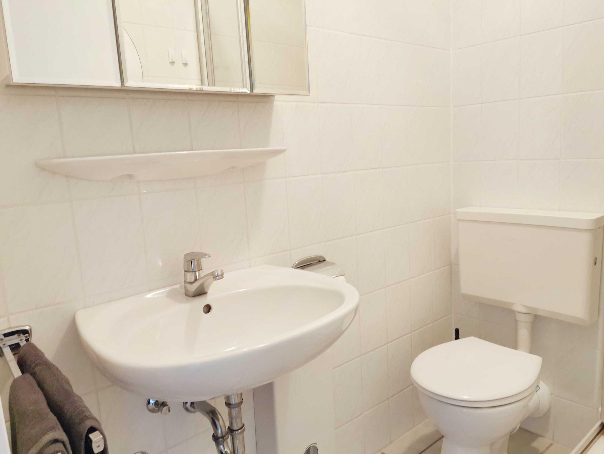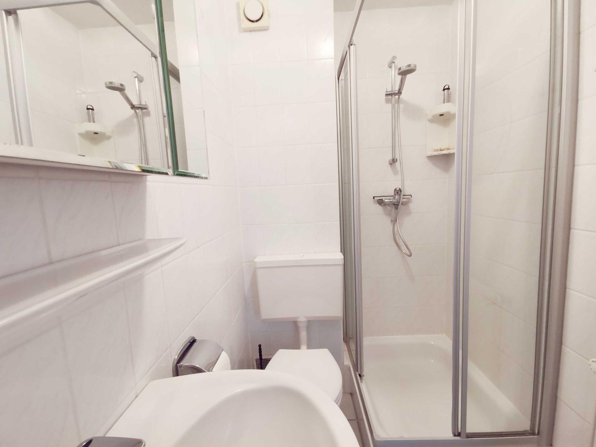 Das Badezimmer verfügt über eine Dusche und ein WC. Ein Haarfön ist vorhanden.