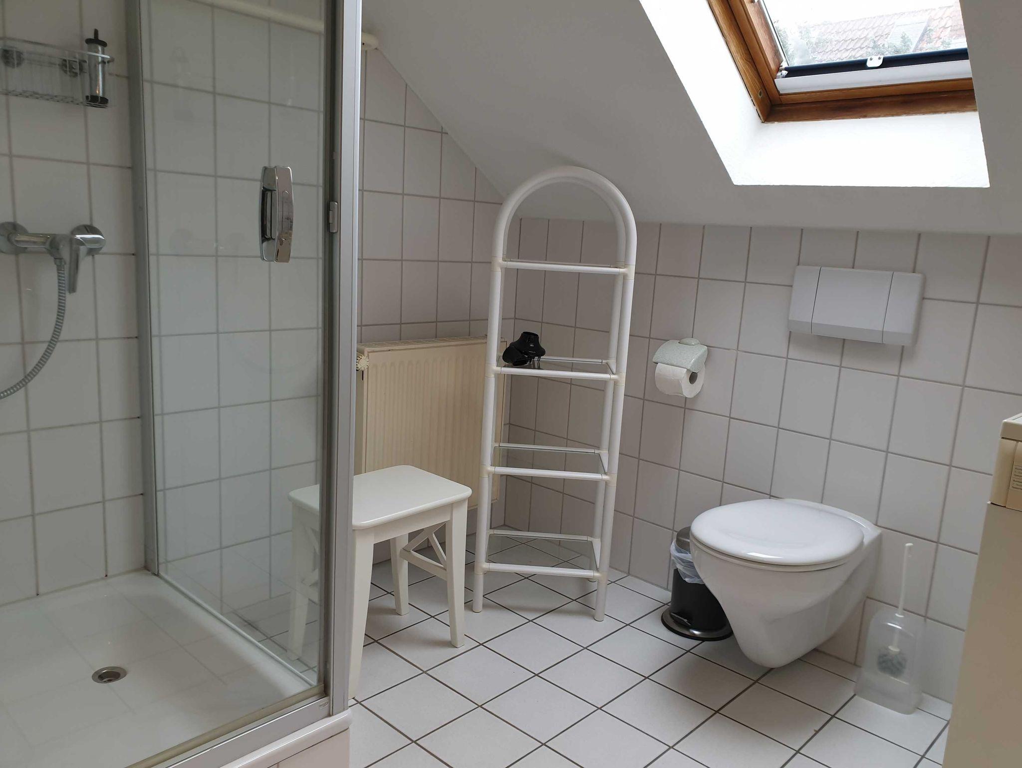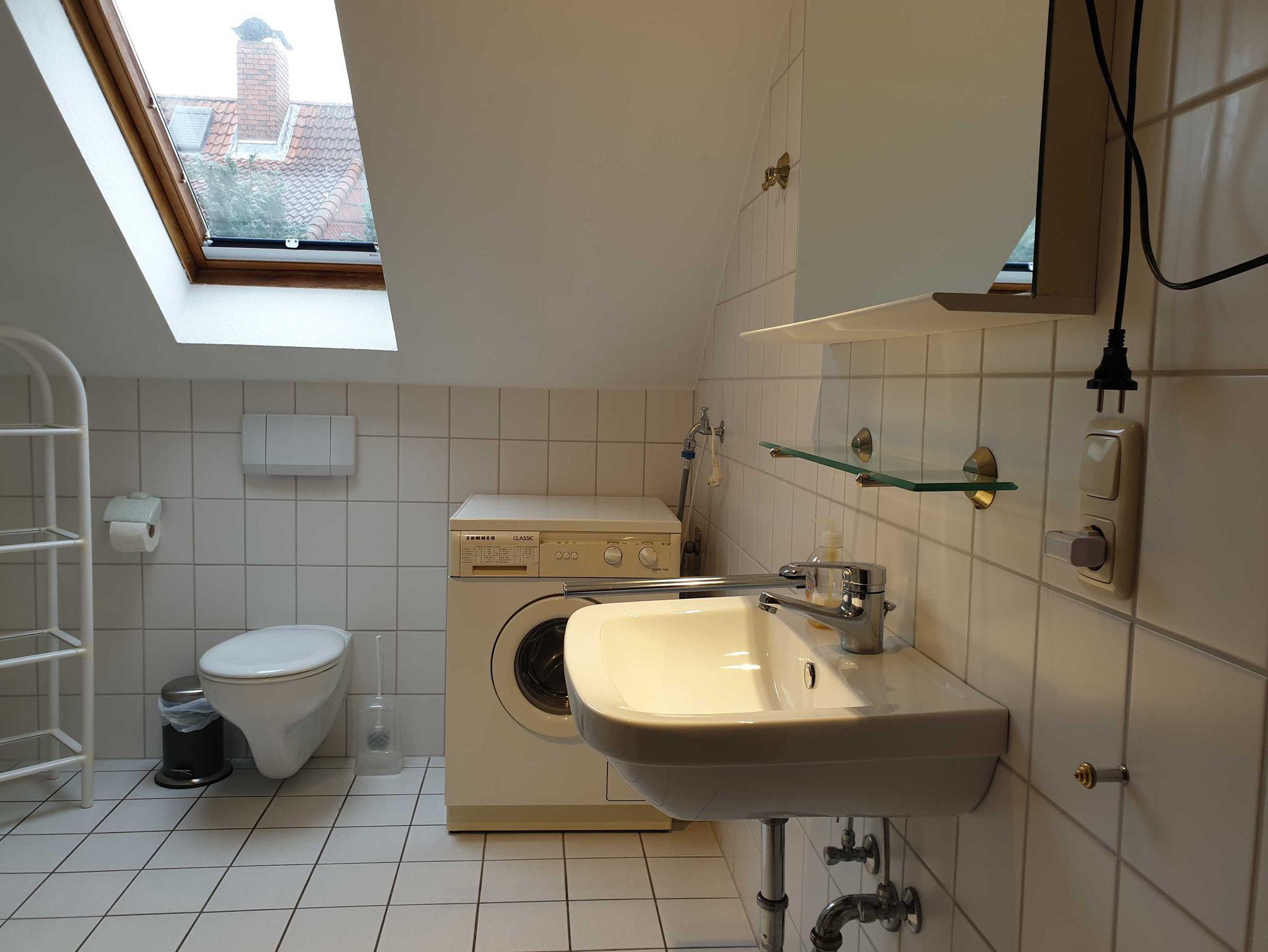 • Voll ausgestattetes Badezimmer mit Dusche, WC, Waschbecken und Waschmaschine im Obergeschoss
