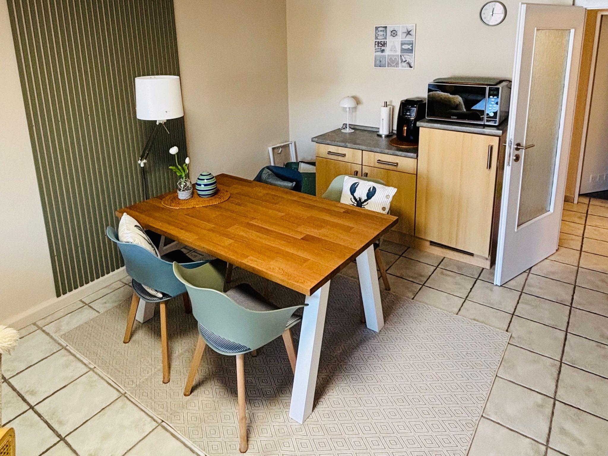 Die Essecke mit vier Stühlen sowie die gemütliche Couchecke mit Flachbildfernseher laden zum Verweilen ein.