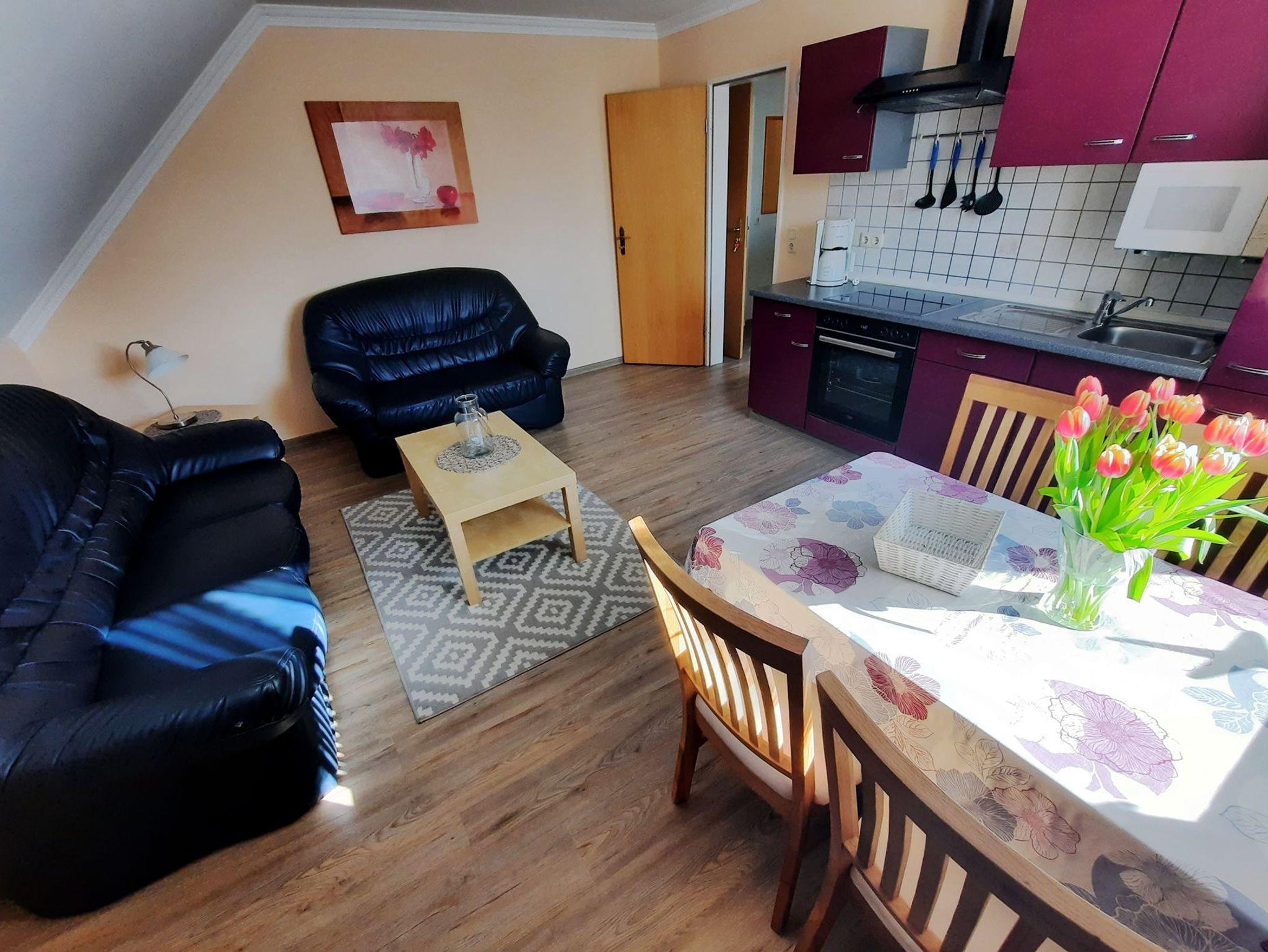 Die Wohnung verfügt auf ca. 55 qm über einen Wohnraum mit vollausgestatteter Küchenzeile, (Toaster, Kaffeemaschine, Wasserkocher, Backofen, Mikrowelle usw.), Couchgarnitur, Kabel-TV und Stereoanlage, 2 getrennte Schlafräume mit jeweils 2 Betten, Dusche / WC und Flur, vervollständigen diese für 2-4 Personen ausgestattete Wohnung