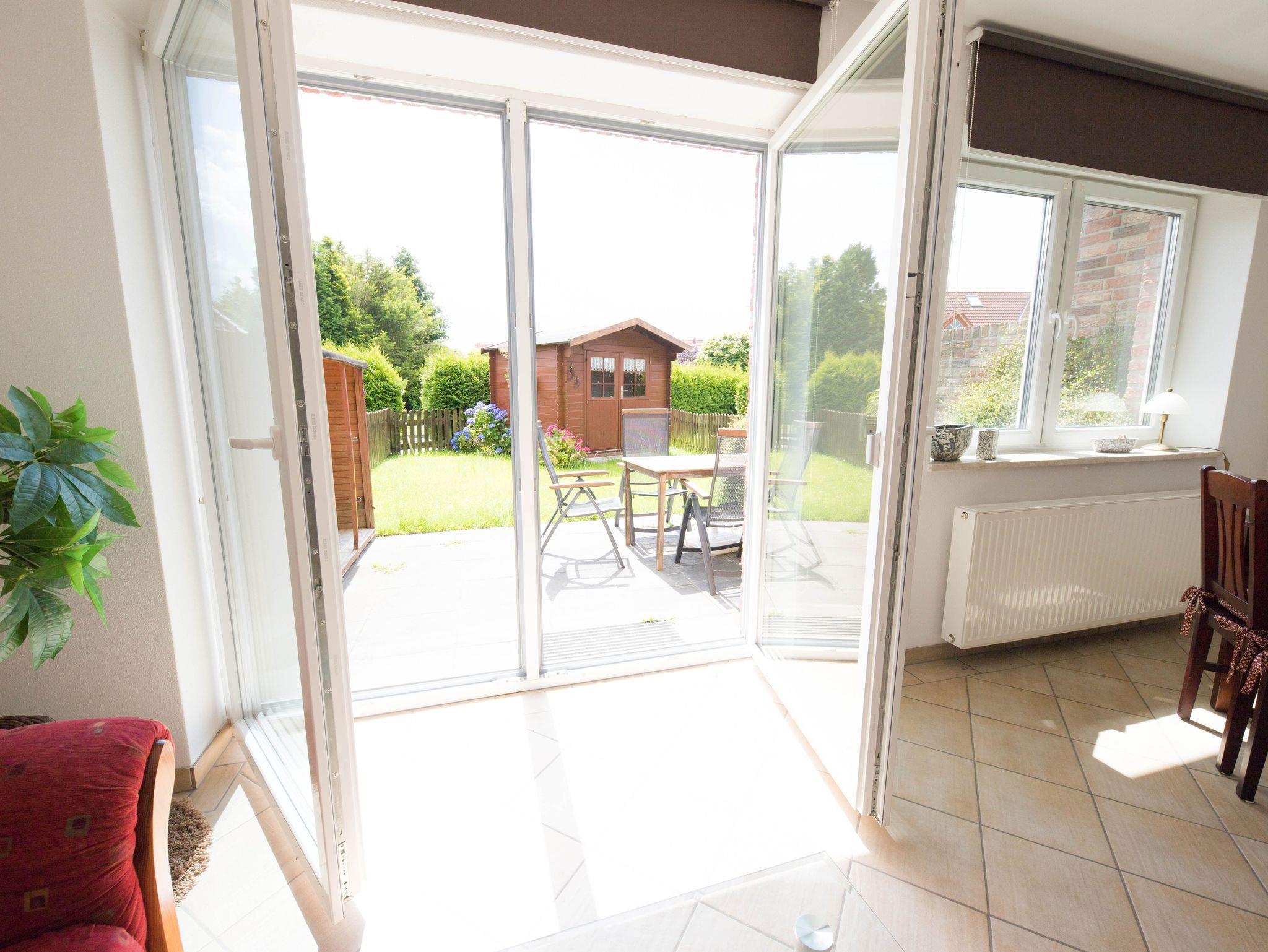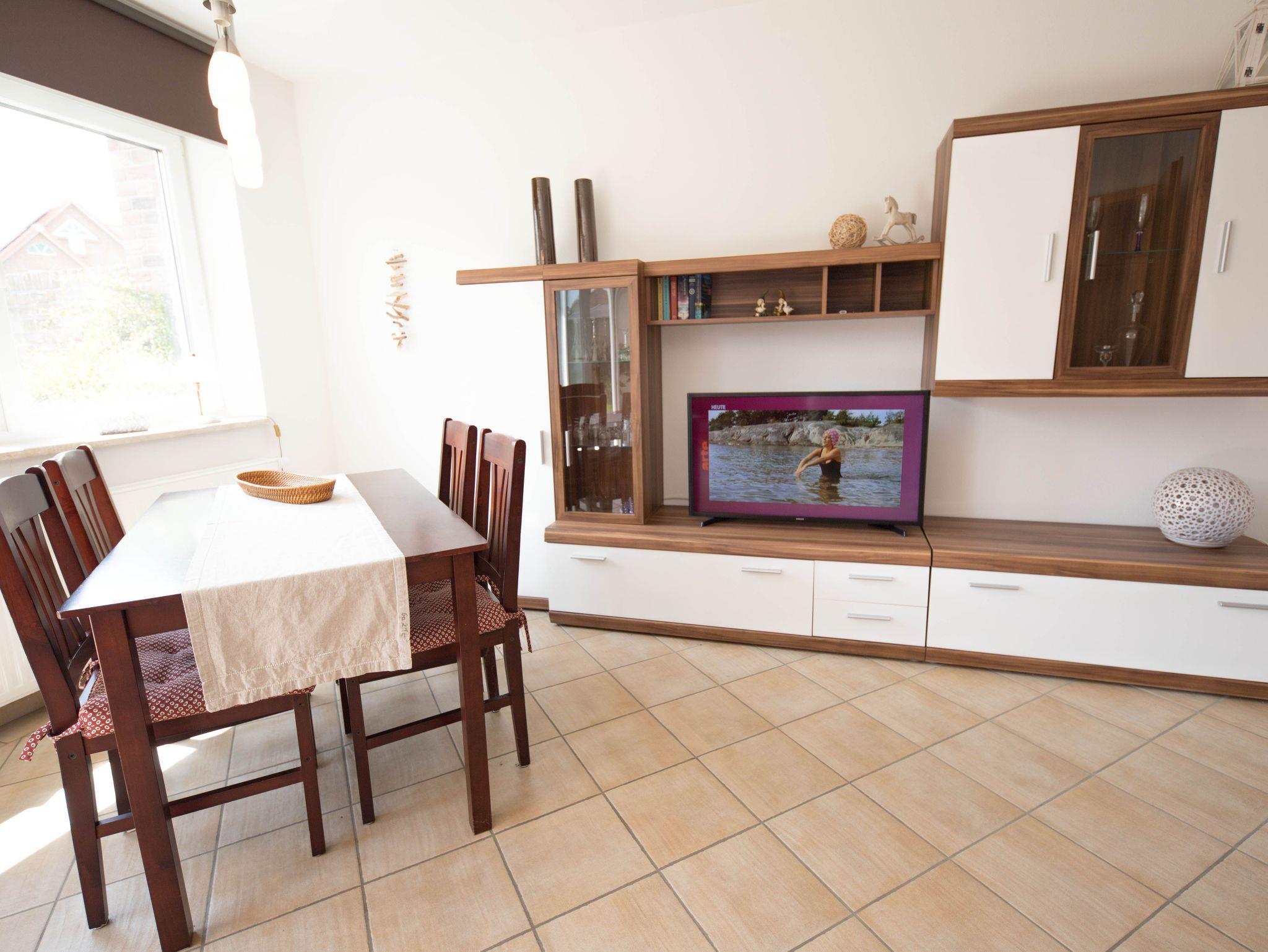 Das Wohnzimmer ist modern und hell eingerichtet. Hier erwartet Sie eine gemütliche Couch, ein freundlich möblierter Esstischbereich sowie schöne Accessoires zum Wohlfühlen. Unterhaltung bieten ein SAT-TV sowie Hifi. 2 Fenster sowie die Glastür zur Terrasse lassen viel Sonne ins Haus. Nach draußen gelangen Sie auf die möblierte Terrasse sowie in den schönen, ruhigen Garten mit Südausrichtung, in dem Sie erholsame Urlaubsstunden verbringen können.