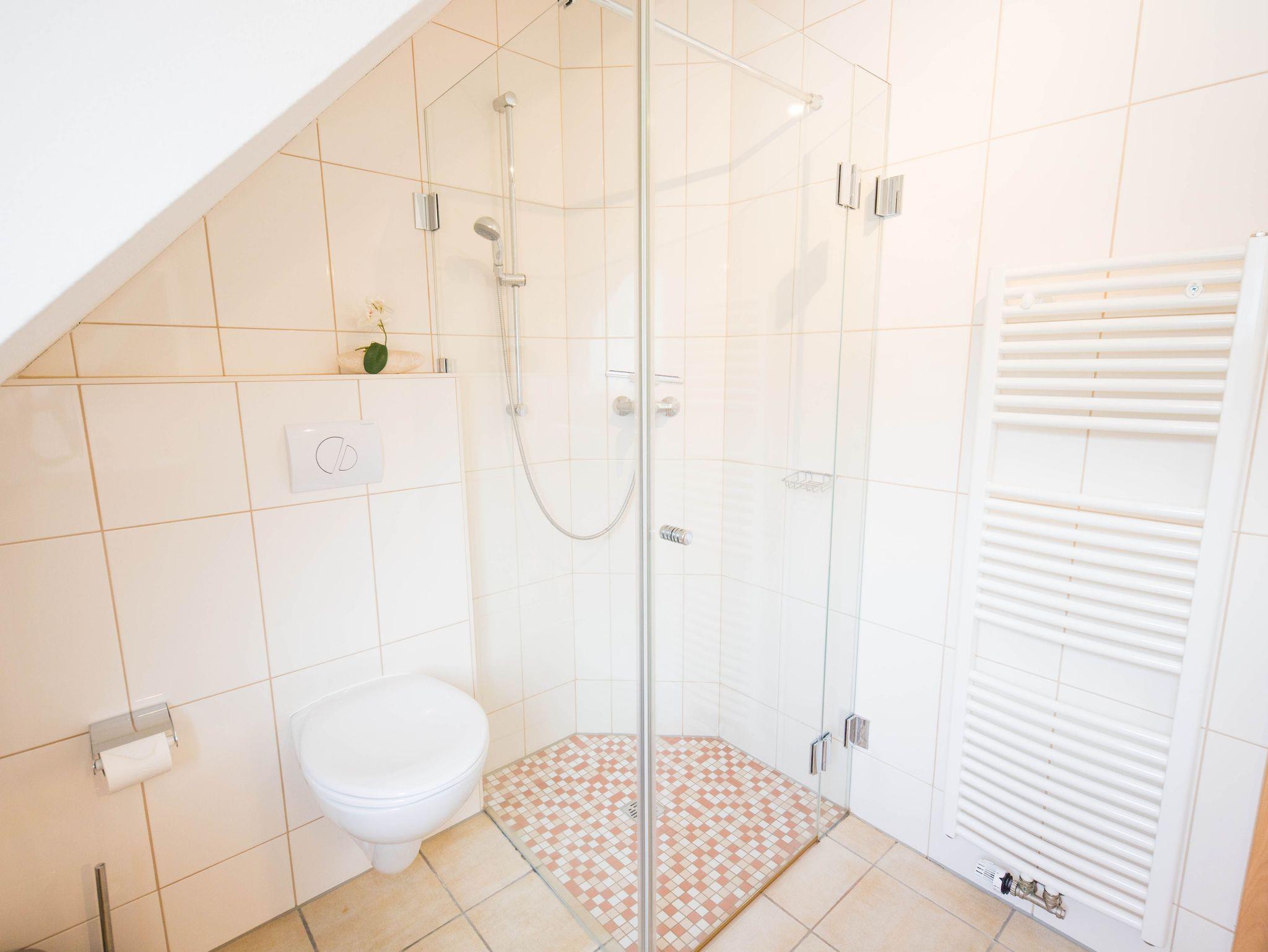 Das Obergeschoss erreichen Sie über eine schöne Holzwendeltreppe. Dort befinden sich 2 Schlafzimmer sowie ein modernes Bad mit Ganzglasdusche.