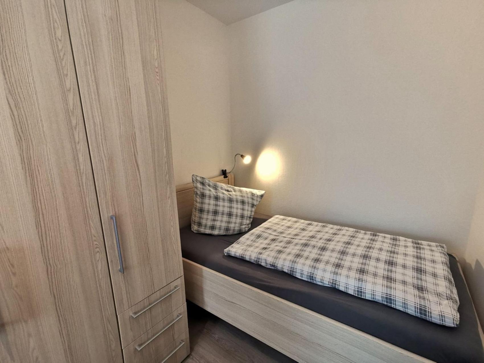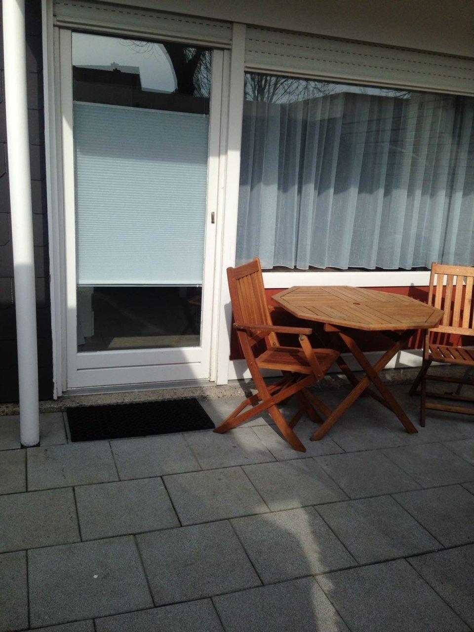 gemütliche Ferienwohnung für 3 Personen in zentraler Lage. 1 Schlafzimmer mit 3 Betten, Flur, moderne Einbauküche mit Durchreiche zum Essplatz, Wohnzimmer mit Zugang zur Terrasse, Vinylboden , modernes Duschbad, Flatscreen-TV, WLAN, Spülmaschine, PKW-Stellplatz