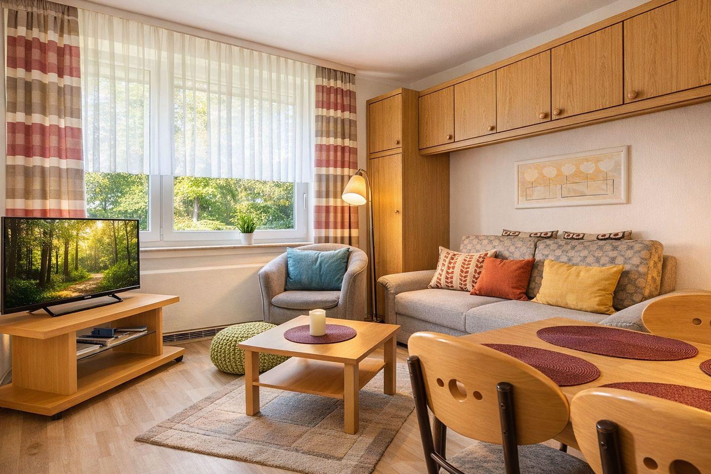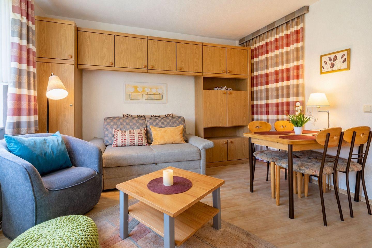 Die gemütlich eingerichtete Ferienwohnung Wolff bietet auf etwa 30 Quadratmetern Wohnfläche ein liebevoll gestaltetes Zuhause auf Zeit und liegt zentral im beliebten Urlaubsort Horumersiel im Fasanenweg. Die Wohnung ist mit viel Sorgfalt und einem Blick fürs Detail eingerichtet und bietet zwei Personen ausreichend Platz für einen entspannten Aufenthalt an der Nordsee. Der offen gestaltete Wohnbereich vereint Wohnen, Schlafen und Kochen auf angenehme Weise und schafft eine behagliche Atmosphäre. Die kleine, im Wohnzimmer integrierte Pantryküche ist funktional ausgestattet und verfügt über ein Kochfeld mit vier Herdplatten, einen Kühlschrank sowie eine Kaffeemaschine, einen Wasserkocher und einen Toaster, sodass einer unkomplizierten Selbstversorgung nichts im Wege steht.