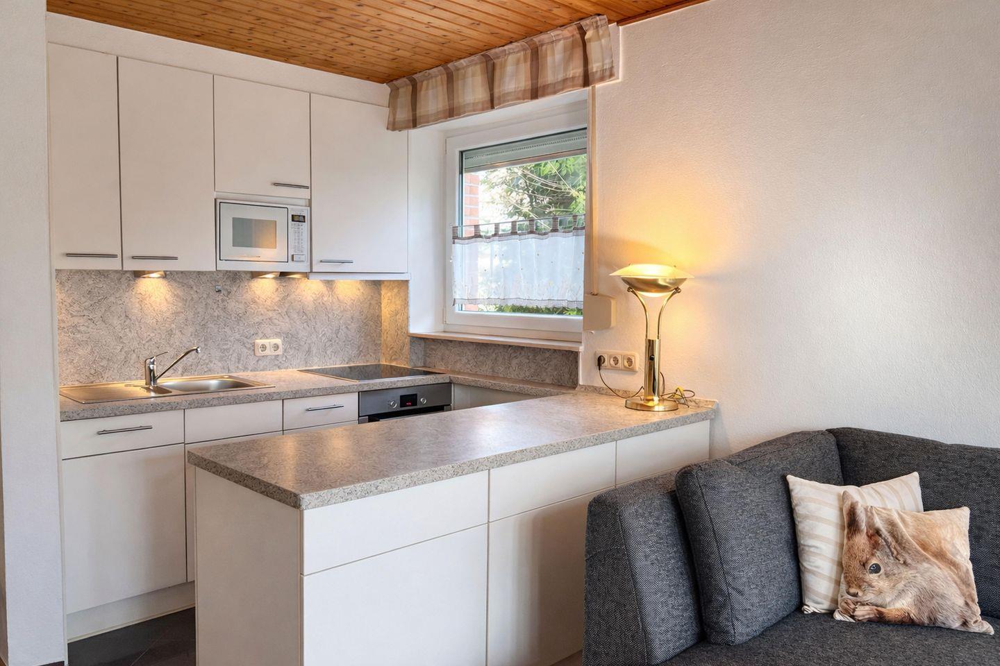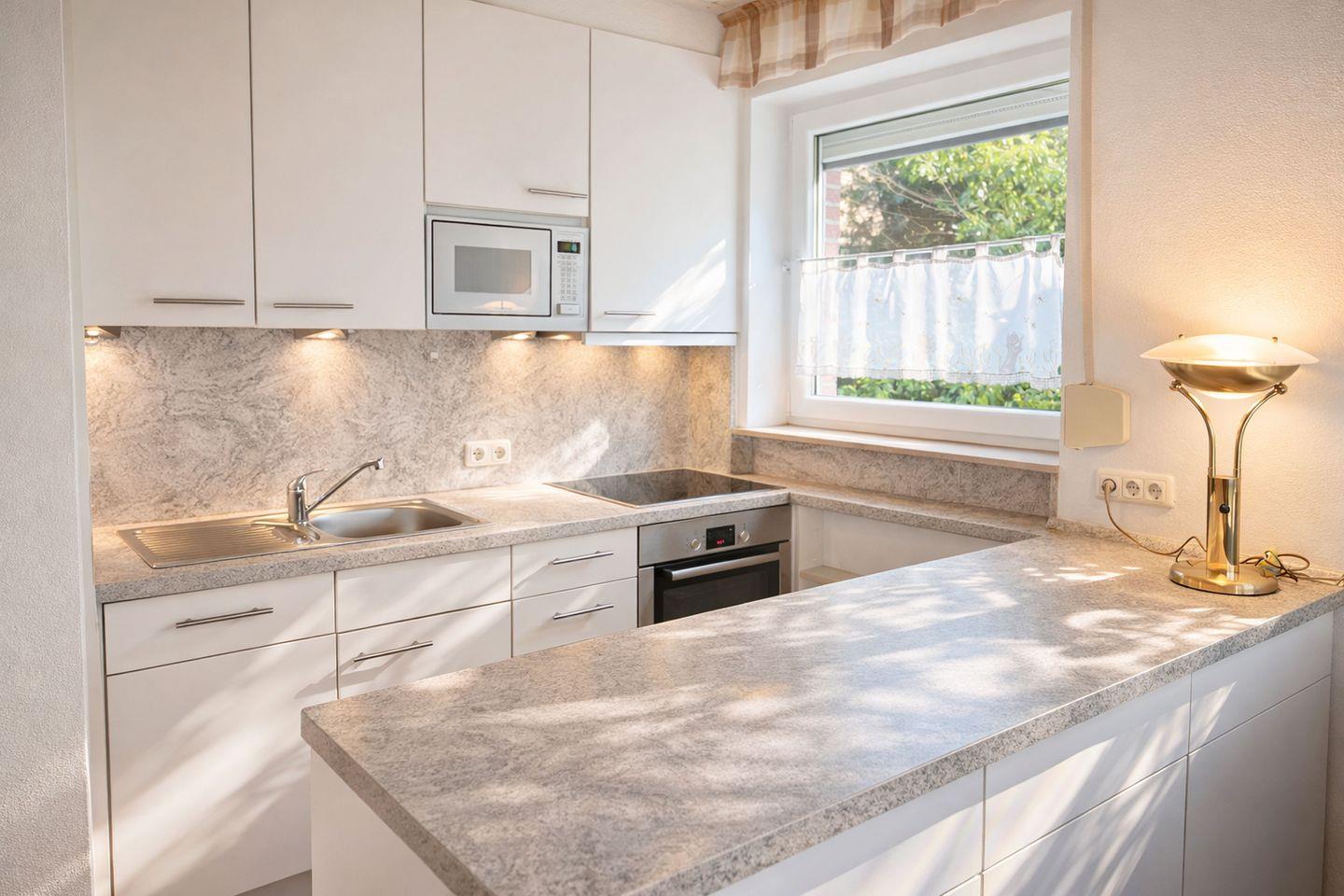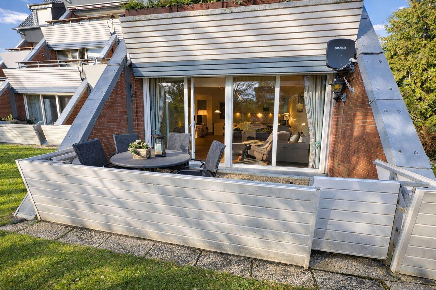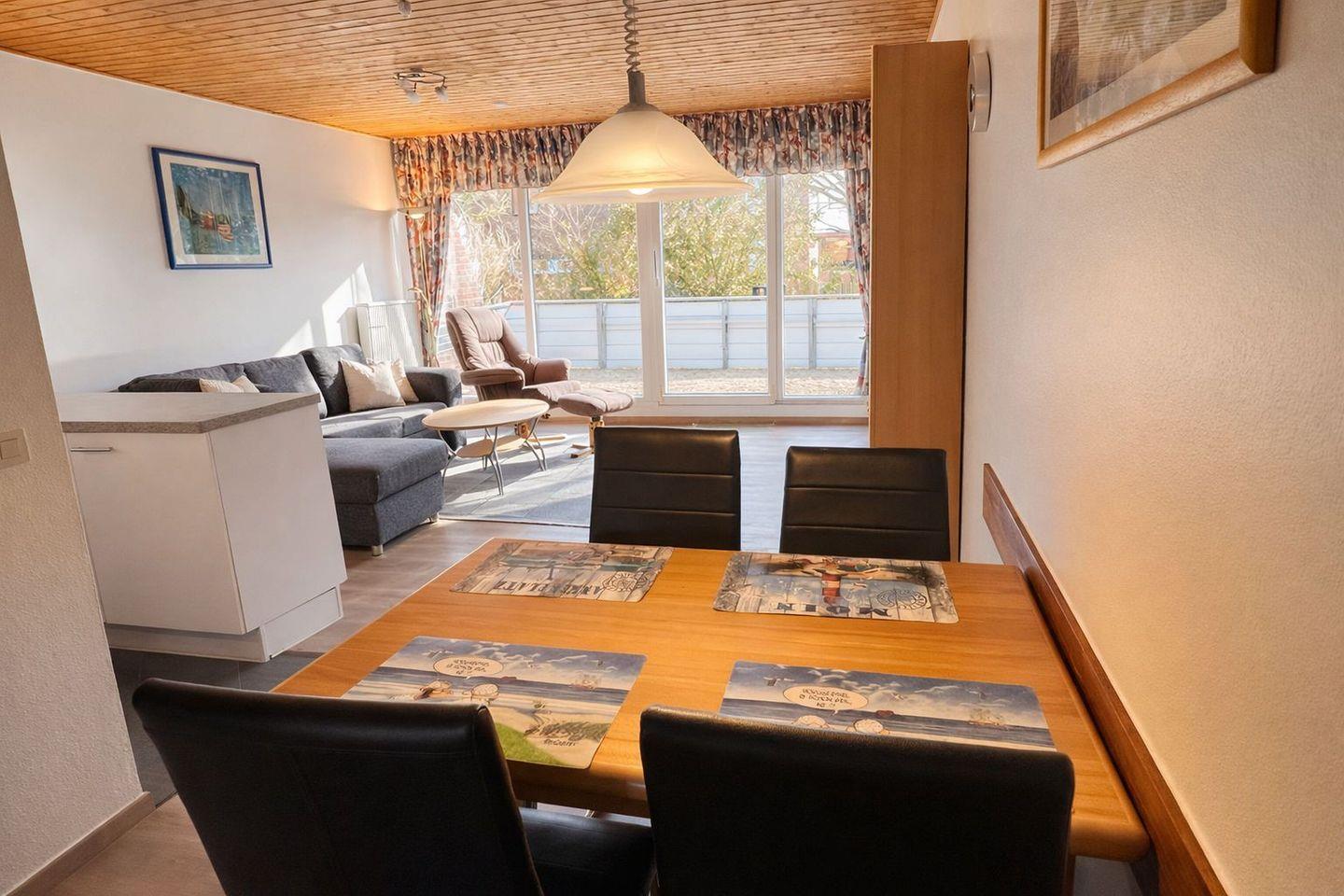 Das helle Wohnzimmer mit gemütlicher Eckgarnitur und praktischem Ausziehsofa bildet den Mittelpunkt der Wohnung. Eine komfortable Fußbodenheizung lässt sich im Wohnzimmer und Flurbereich optional hinzuschalten. Ein großer Flachbildfernseher und eine Musikanlage sorgen für Unterhaltung, während der direkte Zugang zur sonnigen Süd-Terrasse und zum hinteren Rasengrundstück echtes Urlaubsgefühl schafft. Hier können Sie die frische Nordseeluft genießen, entspannen oder gemeinsam schöne Stunden im Freien verbringen.