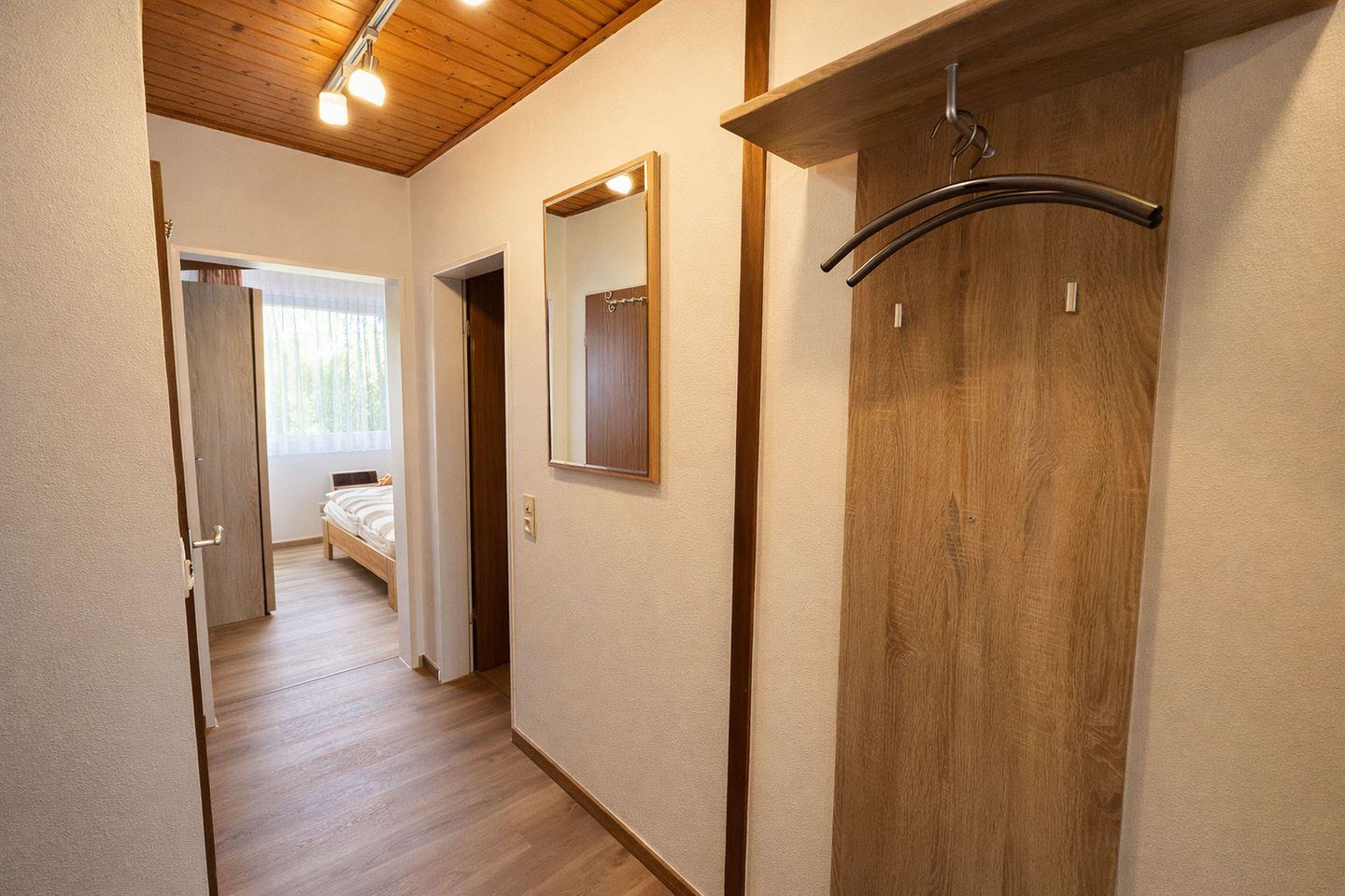 Die Ferienwohnung überzeugt durch eine durchdachte Raumaufteilung und eine helle, freundliche Atmosphäre. Das Schlafzimmer mit komfortablem Doppelbett und eigenem Fernseher lädt zu entspannten Nächten ein, während für die jüngsten Gäste bereits ein Kinderreisebett und ein Hochstuhl zur Verfügung stehen. Das zweite Schlafzimmer ist mit einem Einzelbett ausgestattet und bietet zusätzlich einen Schreibtisch, einen Kleiderschrank sowie eine Musikanlage – ideal für größere Kinder oder Mitreisende, die einen eigenen Rückzugsort schätzen.