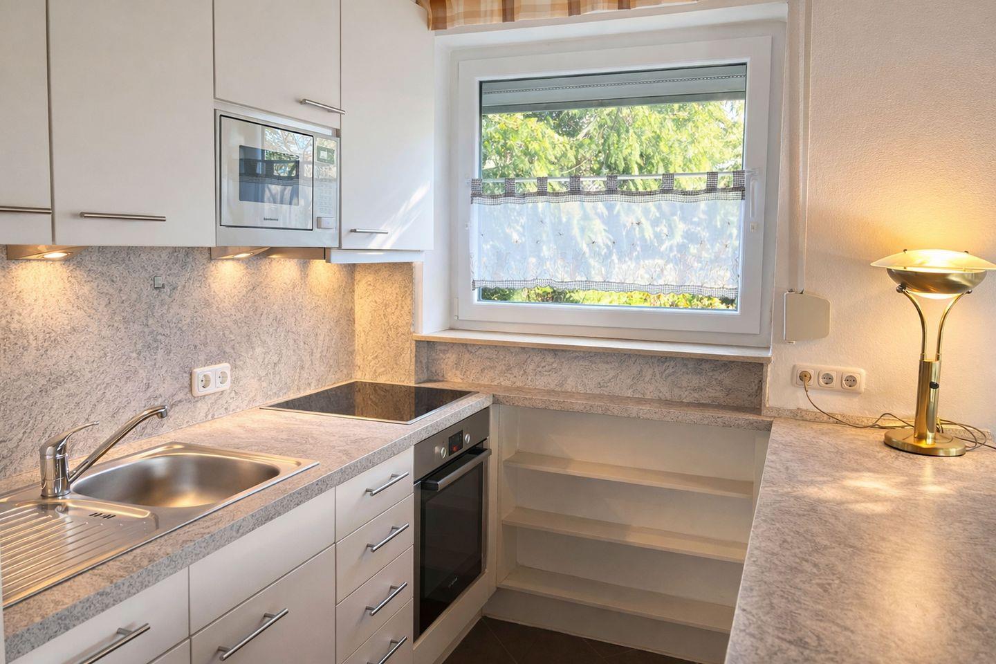 Die offene Küche ist sehr gut ausgestattet und lässt keine Wünsche offen. Geschirrspüler, Kühlschrank mit Gefrierfach, Backofen mit vier Kochfeldern, Kaffeemaschine, Wasserkocher, Toaster und Mikrowelle stehen bereit, damit Sie Ihre Mahlzeiten ganz flexibel zubereiten können. Das Badezimmer mit Fenster verfügt über eine Dusche, WC und eine Waschmaschine, die gerade für längere Aufenthalte komfortabel ist. Alle Räume sind mit Außenrollos ausgestattet und lassen sich vollständig abdunkeln, sodass erholsamer Schlaf jederzeit möglich ist. Laminatböden im Wohn- und Schlafbereich sorgen für eine wohnliche Atmosphäre. Satelliten-TV und kostenfreies WLAN gehören selbstverständlich zur Ausstattung, und für Ihre Wertsachen steht ein Möbeltresor bereit.