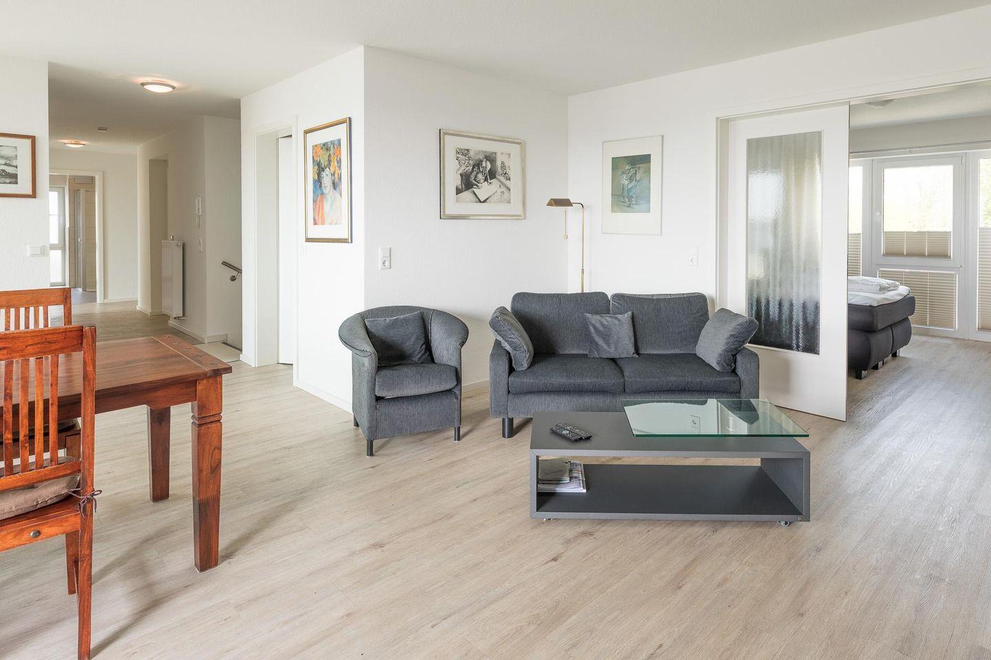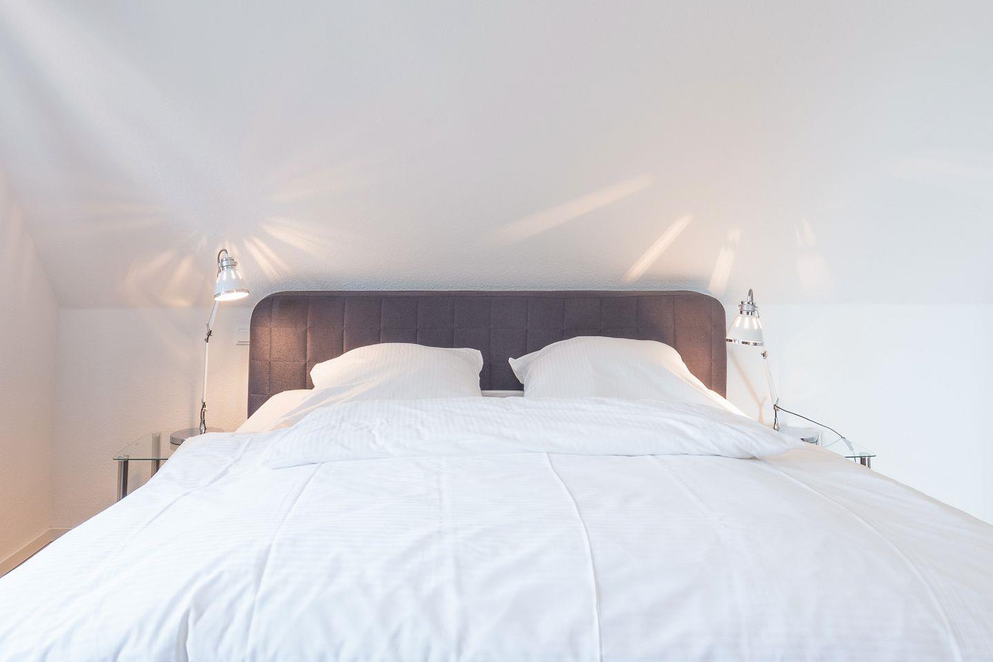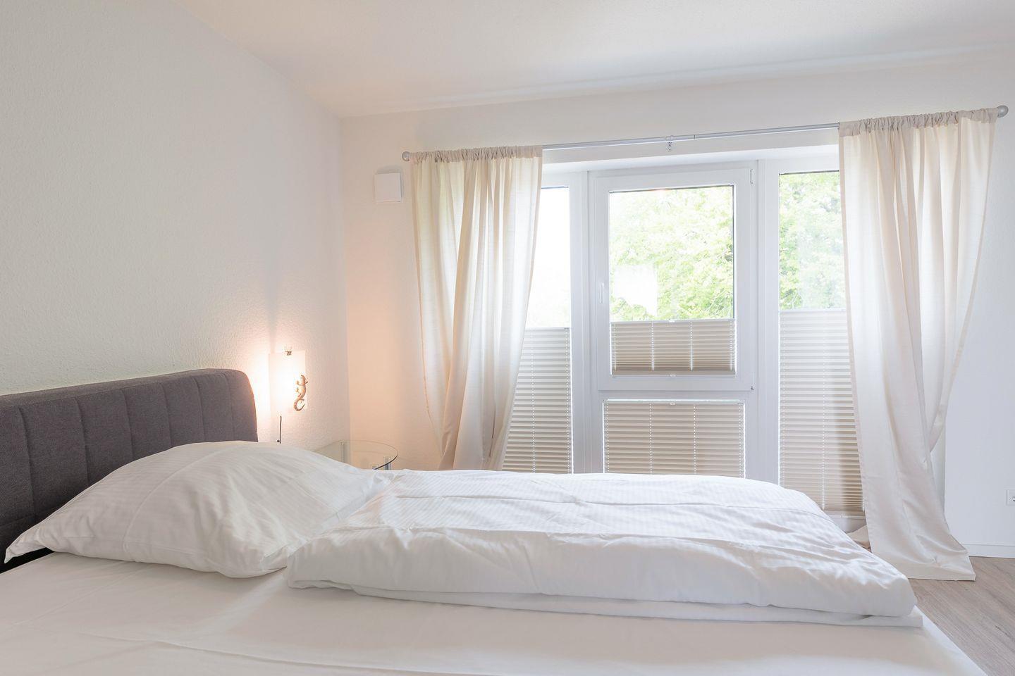 Die Ferienwohnung mit ca. 110 qm Wohnfläche befindet sich im 3. OG und ist mit einem Fahrstuhl barrierefrei erreichbar, der direkt in die Wohnung fährt. Die offene Küche ist mit Geschirrspüler, Backofen, Induktionskochfeld mit 4 Herdplatten, Kühlschrank mit Gefrierfach, Filterkaffeemaschine (Filtergröße 4), Wasserkocher und Toaster eingerichtet. Das offene Wohnzimmer lädt mit einem Flachbild-TV (Kabel) zum Verweilen ein. Die Wohnung verfügt über zwei Schlafzimmer, die jeweils mit einem Boxspring-Bett ausgestattet sind: Schlafzimmer 1 mit 180 x 200 Matratze und Smart-TV (Nutzung mit eigenem Account möglich, kein Kabelanschluss – der Fernseher funktioniert app-basiert wie ein Tablet), Schlafzimmer 2 mit 140 x 200 und Schreibtisch. Die Wohnung bietet Ihnen zwei Duschbäder.