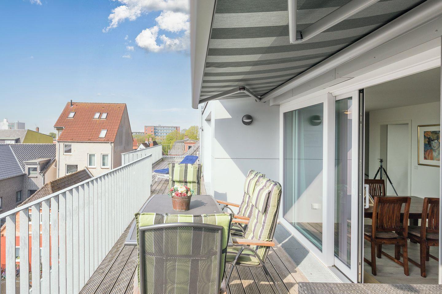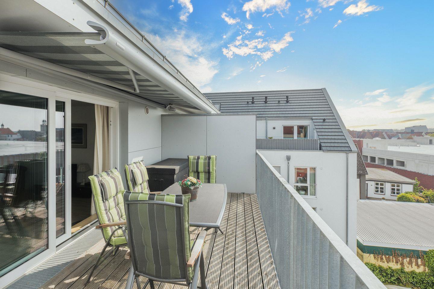 Auf der großen Dachterrasse können Sie über den Dächern von Husum den Tag gemütlich auf komfortablen Gartenmöbeln ausklingen lassen.