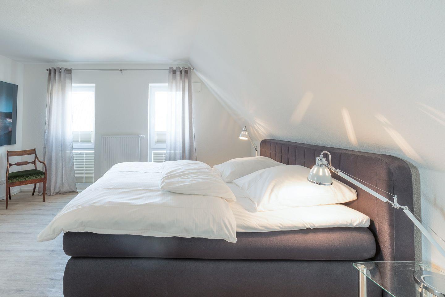 Penthouse-Ferienwohnung im Herzen von Husum, Blick auf den Schlosspark. Zentral gelegen, Restaurants, Cafés, Hafen in der Nähe. 2 Schlafzimmer, 2 Duschbäder, offene Küche, Wohnzimmer mit Flachbild-TV. Barrierefrei mit Aufzug, kostenlosem WLAN und Tiefgaragenparkplatz. Dachterrasse mit Gartenmöbeln. Nichtraucher-Domizil. Erstausstattung an Bettwäsche und Handtüchern inklusive. Zusätzliche Wäschepakete verfügbar. Tennisplatz in der Nähe buchbar. Genießen Sie Husum und die Krokusblüte!
