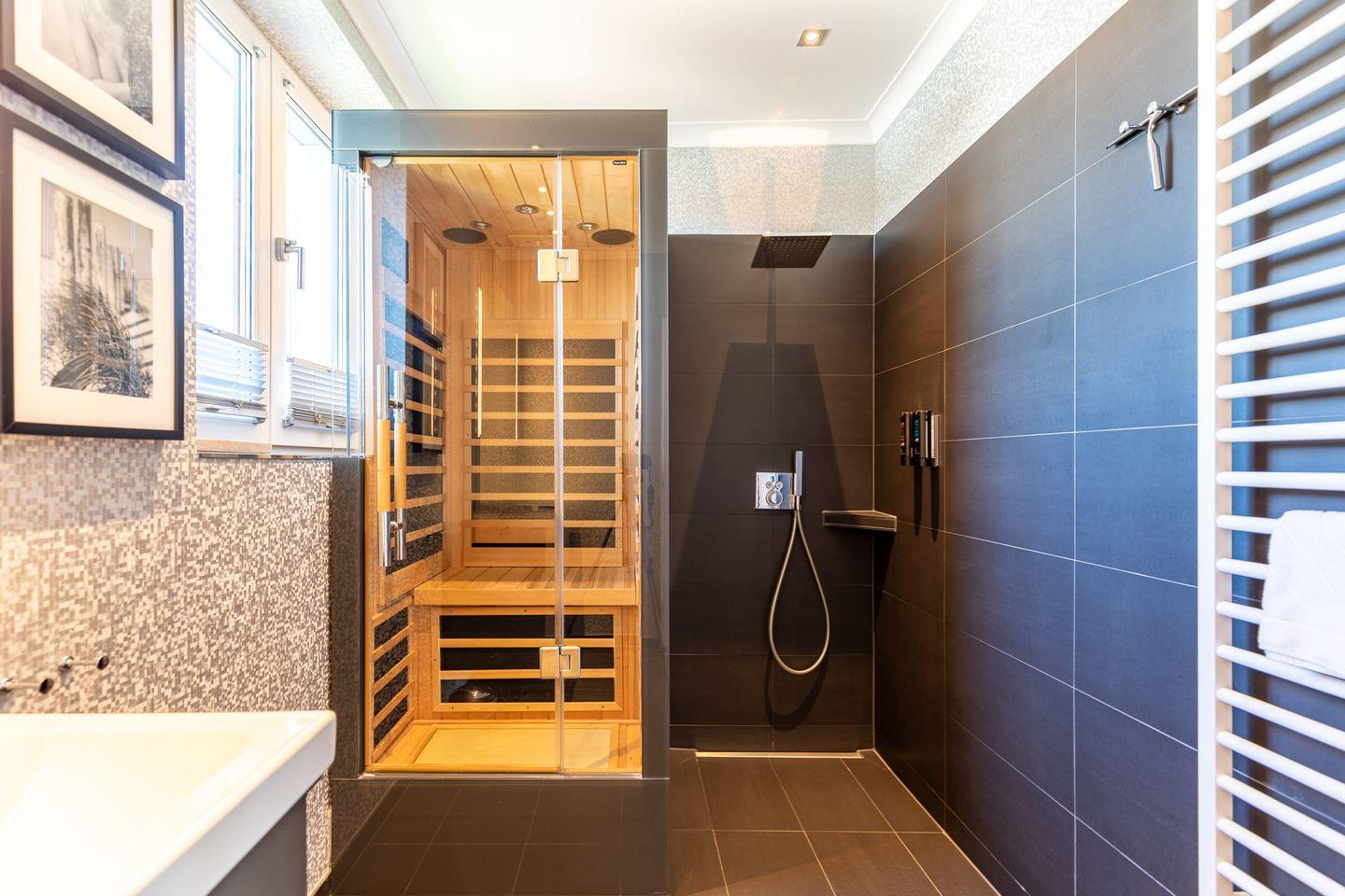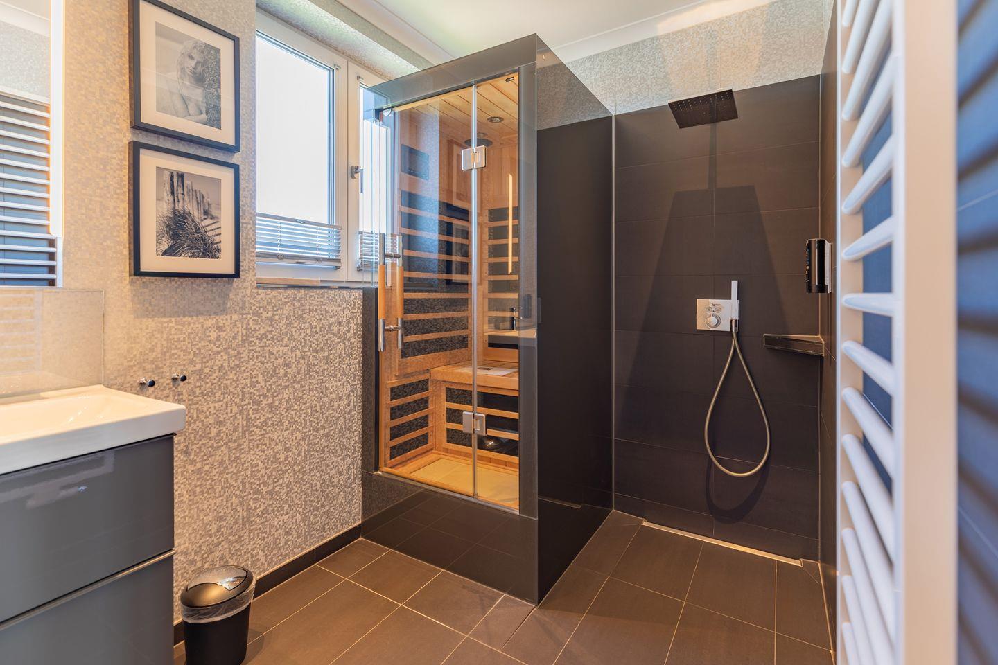Das großzügige Badezimmer bietet Ihnen neben der Wellnessdusche eine Infrarot-Sauna, von der aus Sie den schönen Blick über Husum genießen können.