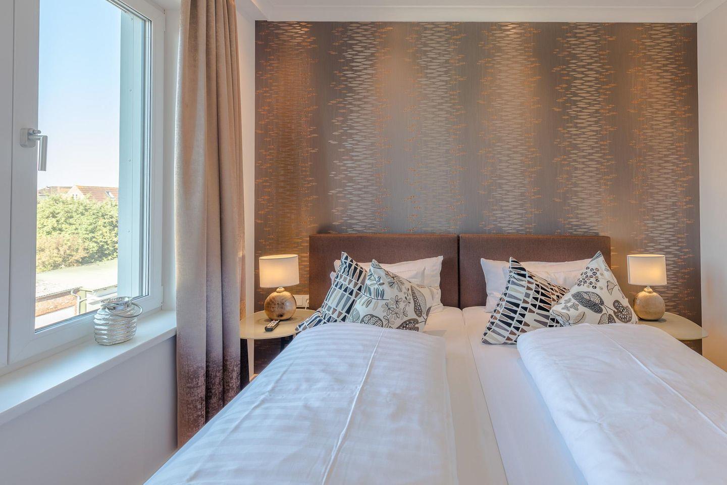 Das offene Wohnzimmer mit seiner gemütlichen Sitzecke lädt mit einem Flachbild-TV (Kabel) zum Verweilen ein. Die Wohnung verfügt über zwei Schlafzimmer, die jeweils mit Boxspring-Betten (180 × 200 und 2 mal 180 × 90 (zusammen schiebbar) und TV ausgestattet sind.