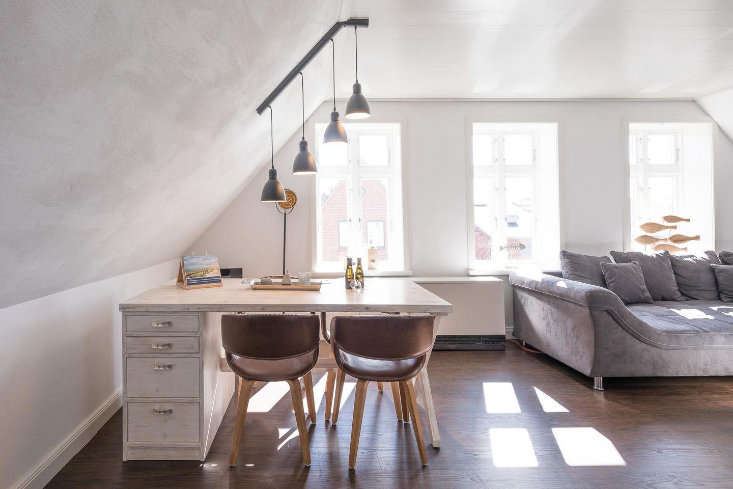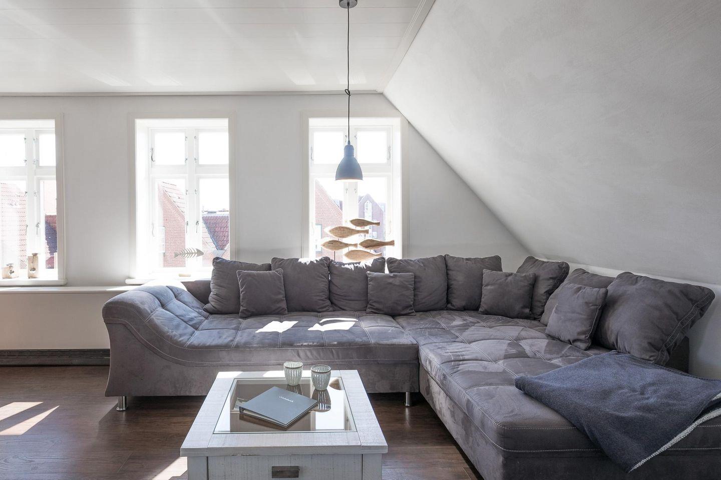 Auf der gemütlichen Wohnlandschaft im offenen Wohnbereich können Sie bei einem guten Buch oder einem spannenden Film den Tag über den Dächern Husums gemütlich ausklingen lassen.