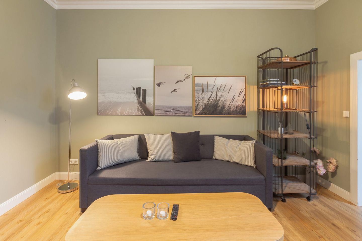 Die Ferienwohnung ist geschmackvoll für 3 Personen eingerichtet: ein Schlafzimmer mit einem bequemen Doppelbett (180 x 200), ein weiteres Schlafzimmer mit einem Bett 120 x 200, einem großen Sofa für die Lektüre Ihres spannenden Urlaubsbuches, ein großzügiges Wohnzimmer und eine komfortable und gut ausgestattete, separate Küche mit Ceranfeld, Backofen, Geschirrspülmaschine, Kaffeemaschine (Filtergröße 4) und einem Essbereich.