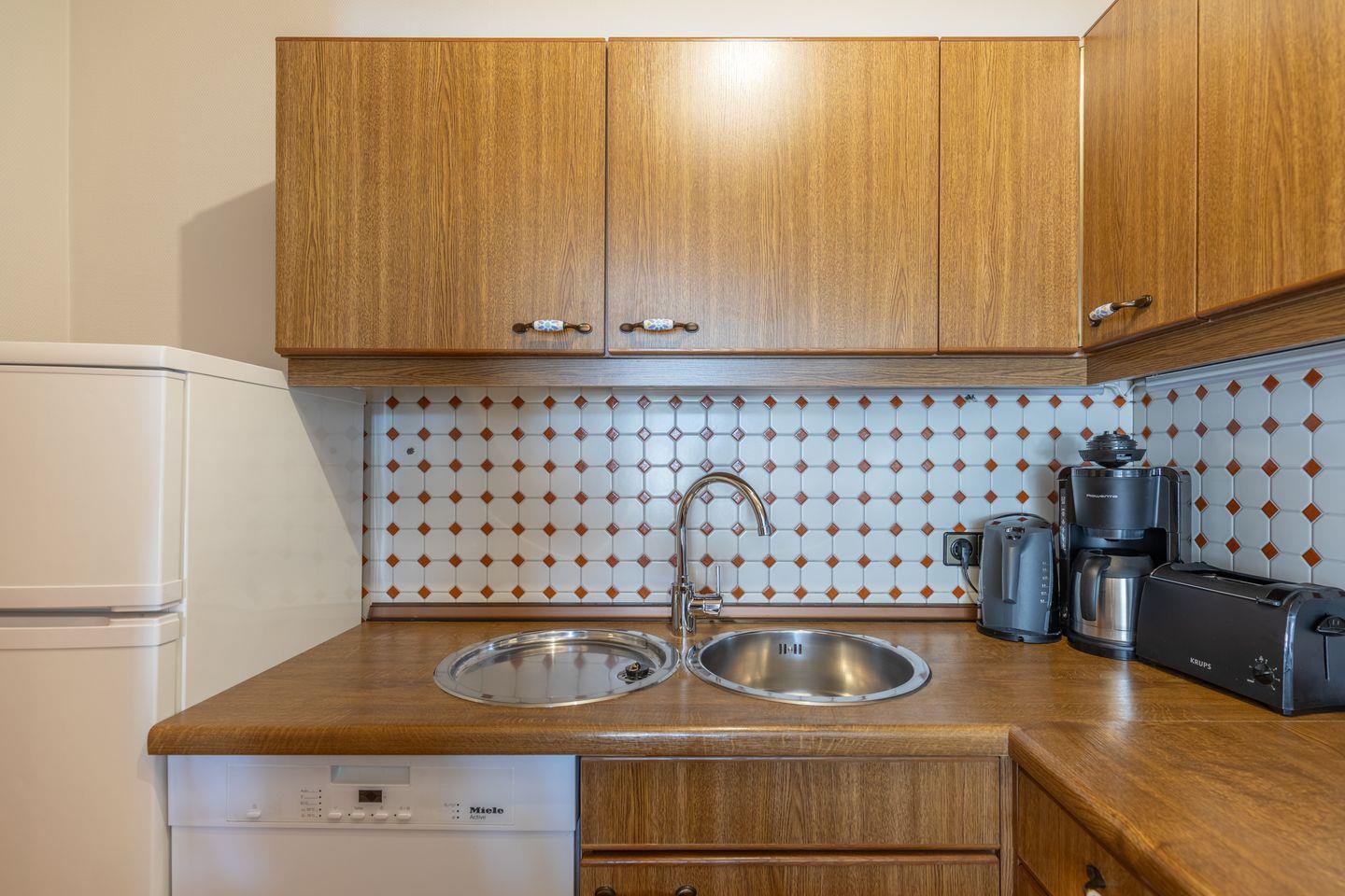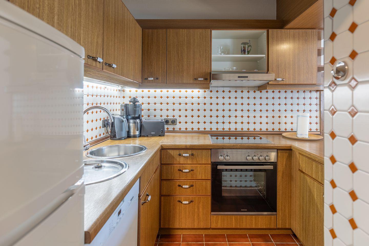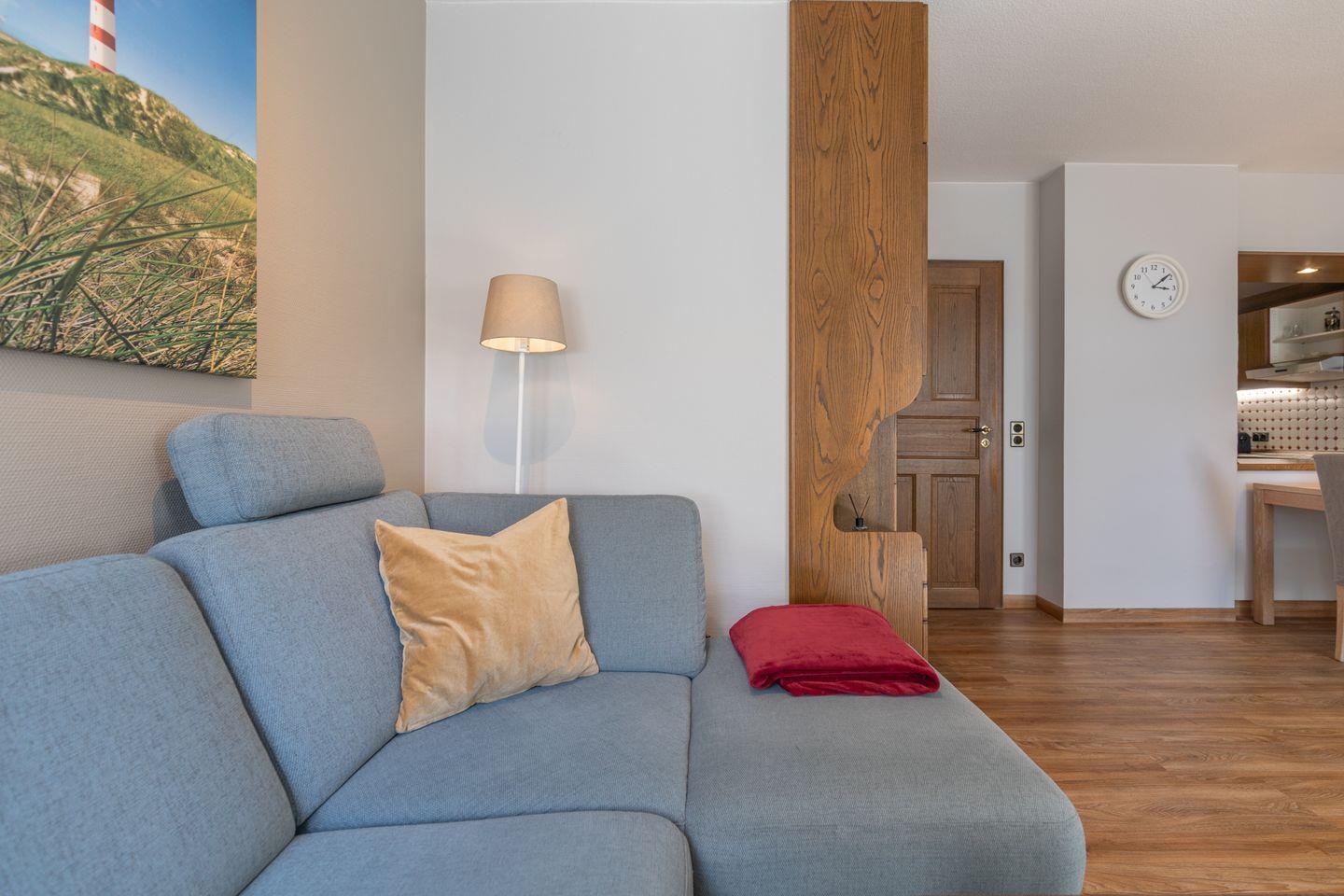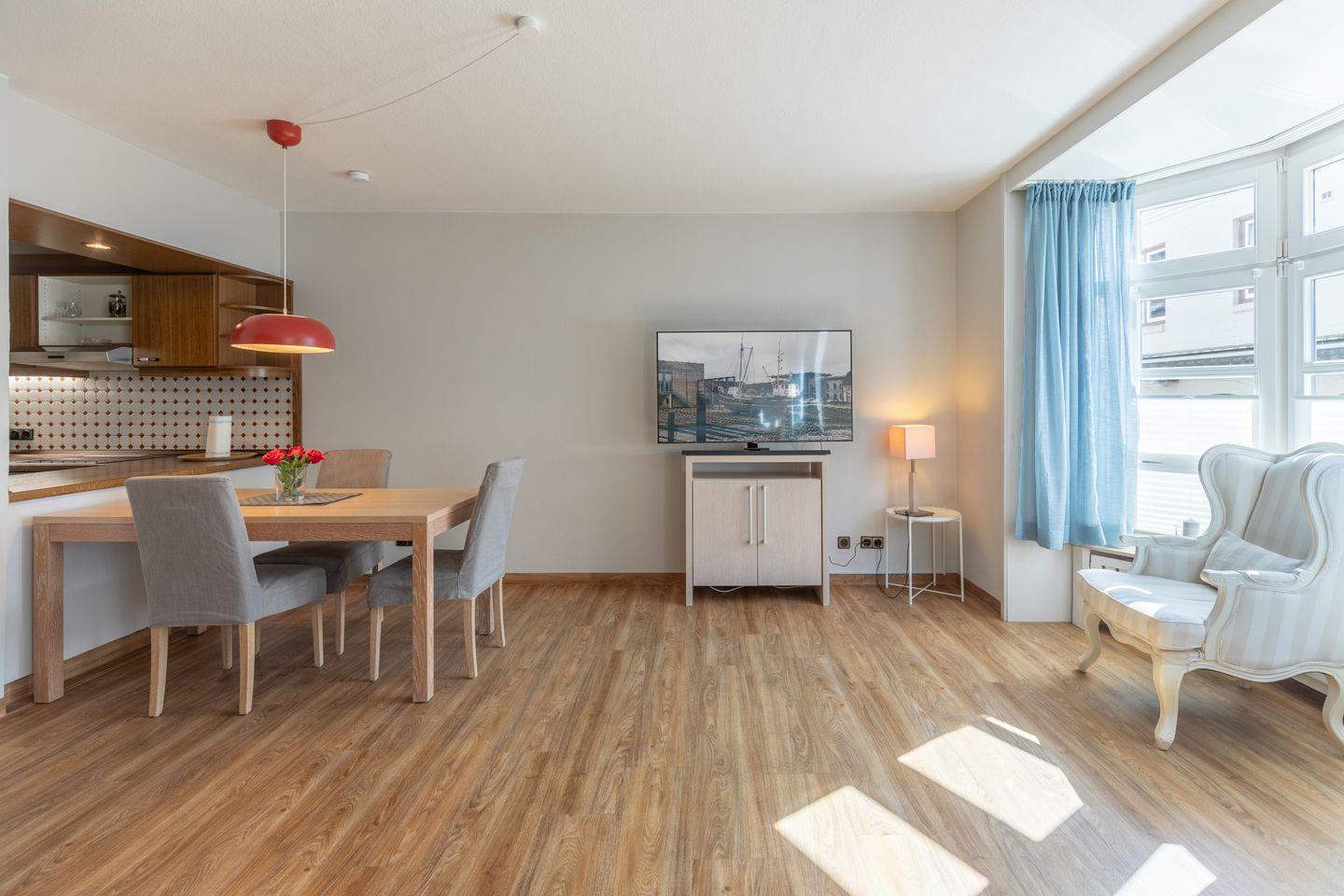 Die Ferienwohnung eignet sich für bis zu zwei Personen. Sie bietet ein Schlafzimmer mit einem Doppelbett 180 × 200, ein Duschbad und einen großzügigen Wohnbereich mit einem bequemen Sofa, SAT-TV und Leseecke. In der offenen Küche finden Sie einen Herd mit Cerankochfeld, Backofen, Geschirrspülmaschine, Toaster, Wasserkocher, Filterkaffeemaschine u. v. m.