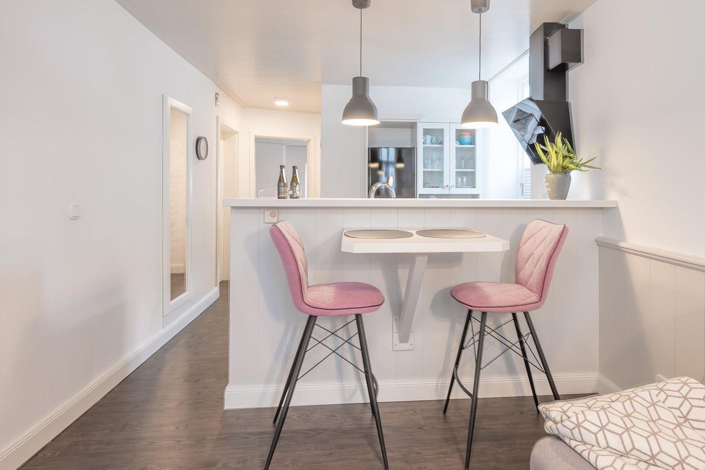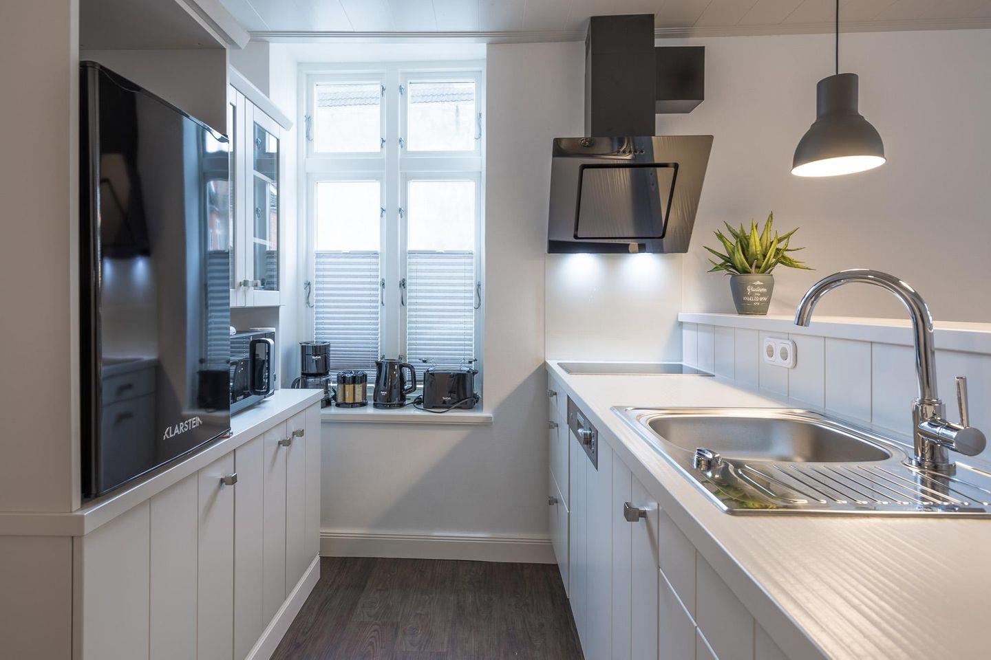 Das Ferienhaus mit 45 qm Wohnfläche wurde komplett renoviert und liebevoll eingerichtet. Geschmackvolles Wohnzimmer mit Flachbild-TV, Essbereich mit 2 Barhockern, komfortabel eingerichtete, offene Küche mit Geschirrspüler, 2-Platten-Ceranfeld, Kühlschrank mit Gefrierfach, Filterkaffeemaschine (Filtergröße 4), Wasserkocher und Toaster. Das Schlafzimmer ist mit einem gemütlichen Boxspringbett (180 × 200) und mit einem TV ausgestattet.