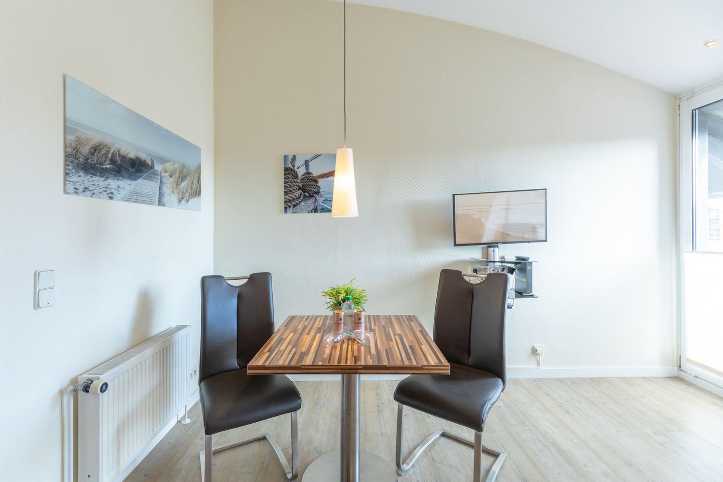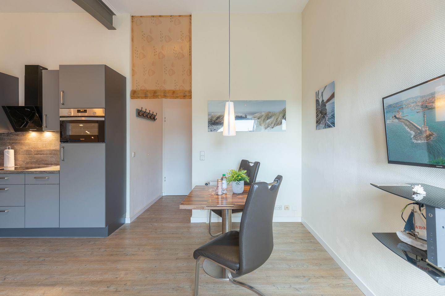 Die Studio-Wohnung ist modern eingerichtet: Ein Schlafzimmer mit einem Doppelbett (180 x 200) und eine offene und gut ausgestattete Einbauküche mit 4-Platten-Herd, Backofen, Geschirrspülmaschine, Kaffeemaschine (Filtergröße 4). Der Wohnbereich verfügt über ein bequemes Sofa, einen Flachbild-TV und einen Essbereich. Das moderne Badezimmer ist mit einer Dusche, WC und Waschbecken eingerichtet. Vom kleinen Balkon aus können Sie mit Blick auf den Hafen den Tag gemütlich ausklingen lassen.