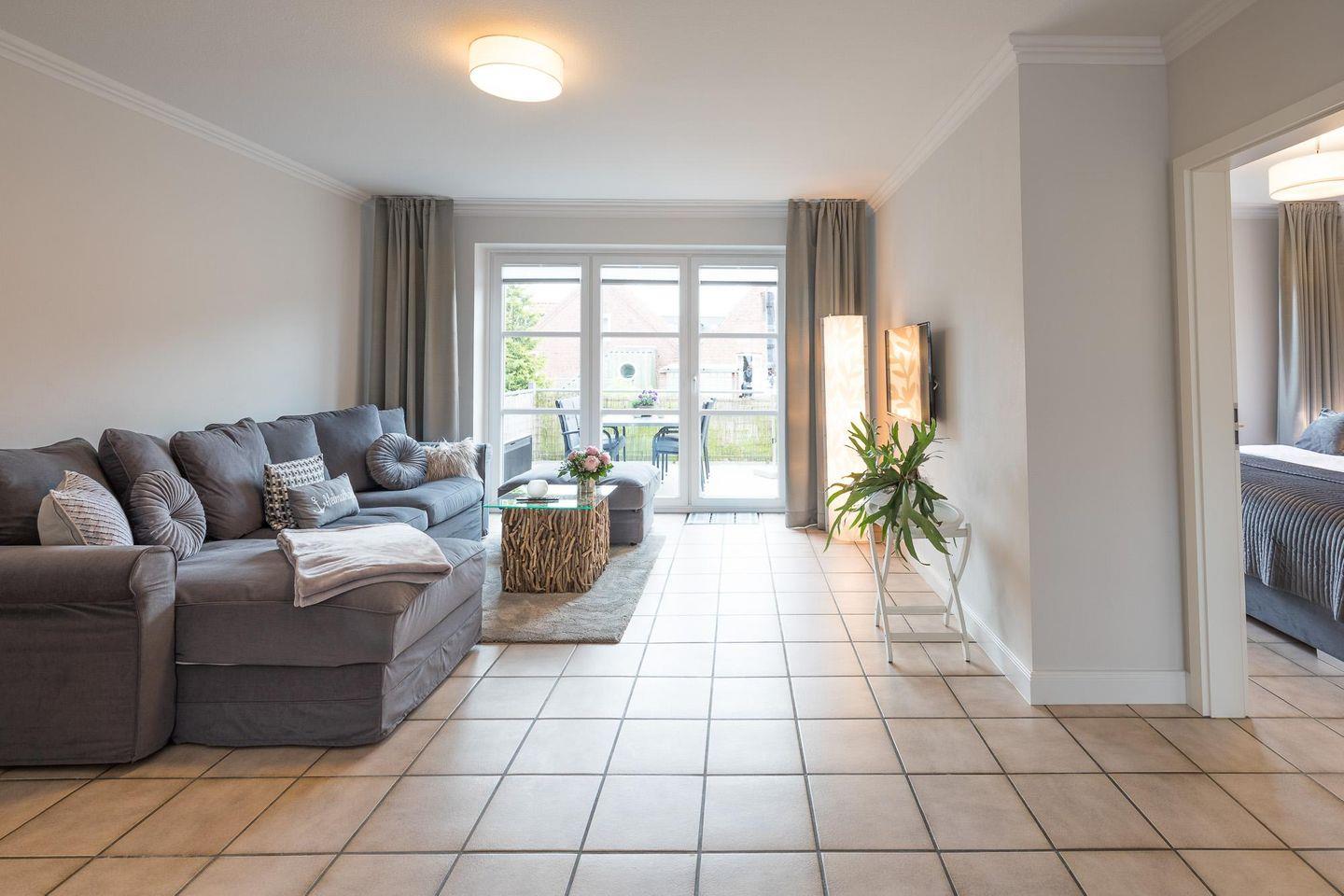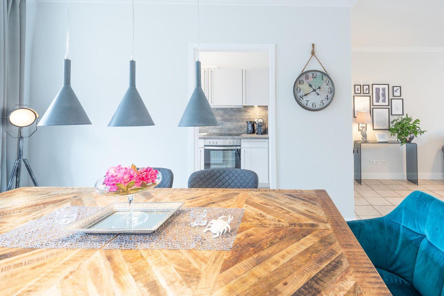 Die Ferienwohnung mit 74 qm Wohnfläche wurde komplett renoviert und komfortabel eingerichtet. Geschmackvolles Wohnzimmer mit Schlafsofa und Flachbild-TV, Essbereich, komfortabel eingerichtete Küche mit Geschirrspüler, 4-Platten-Ceranfeld, Mikrowelle, Kühlschrank mit Gefrierfach, Waschmaschine, Filterkaffeemaschine (Filtergröße 4), Nespresso-Maschine, Wasserkocher und Toaster. Das Schlafzimmer ist mit einem gemütlichen Boxspringbett (180x200) und mit einem TV ausgestattet.