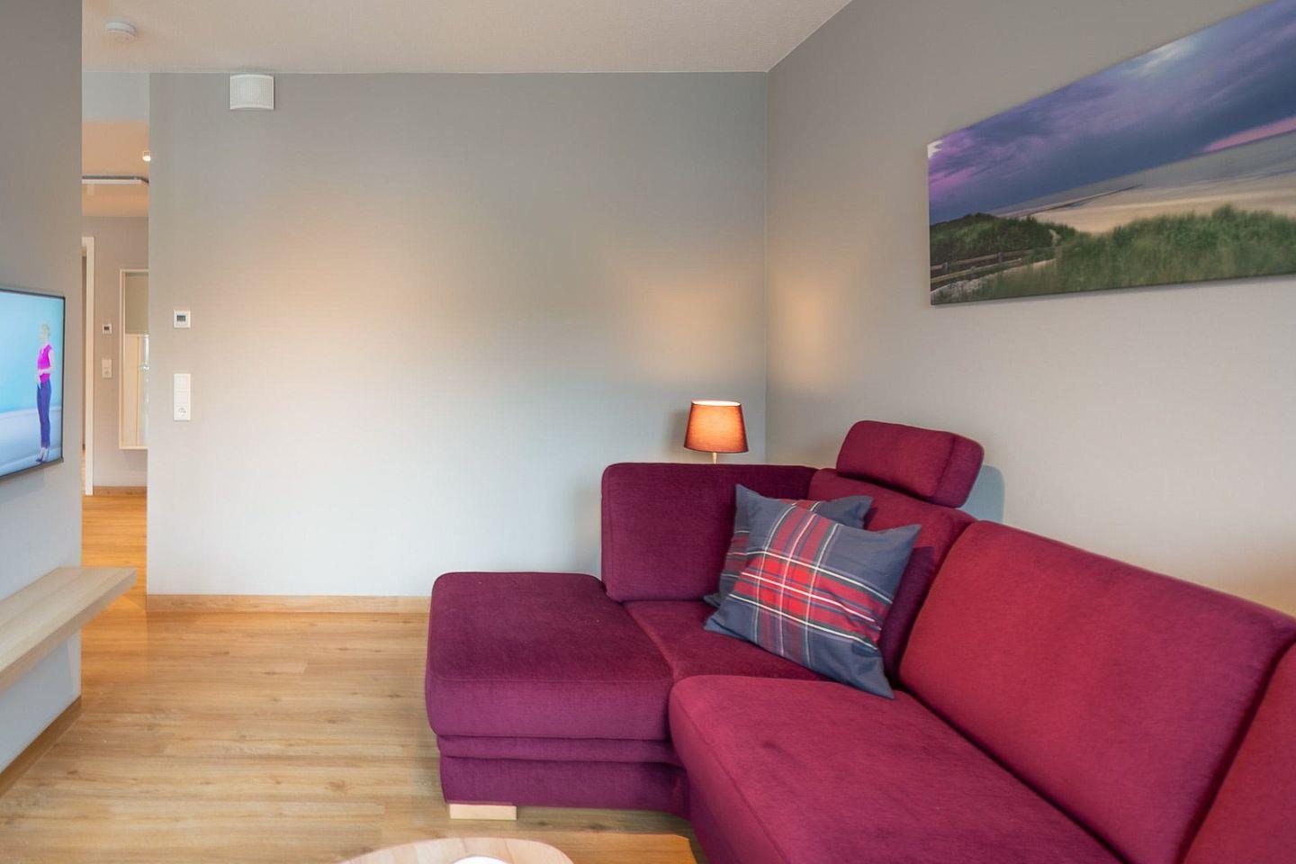 Die Ferienwohnung ist sehr hochwertig eingerichtet: ein Schlafzimmer mit einem bequemen Boxspringbett (180 x 200). Ein weiteres, kleines Schlafzimmer mit einem Boxspringbett (90 x 200) verschafft Ihnen den nötigen Freiraum. Die offene und komfortable Einbauküche bietet Ihnen ein Ceranfeld, Backofen, Geschirrspülmaschine, Kaffeemaschine (Filtergröße 4), Toaster und Wasserkocher. Der Wohnbereich verfügt über ein gemütliches Sofa und einen Flachbild-TV. Das moderne Badezimmer ist mit einer großen Dusche, WC und Waschbecken eingerichtet. Auf der sonnigen Terrasse können Sie den Tag gemütlich ausklingen lassen.