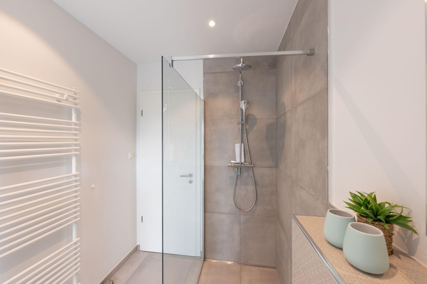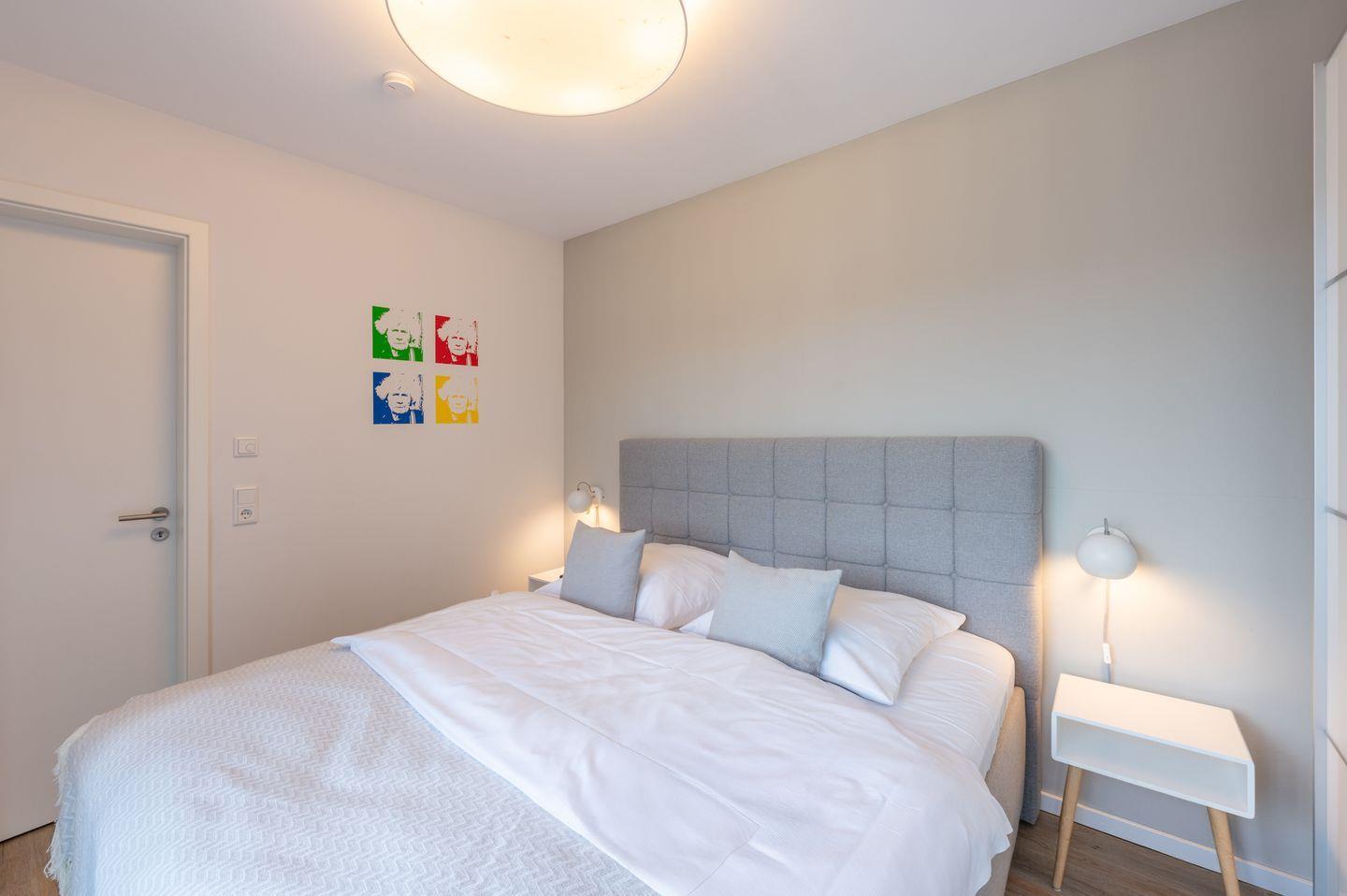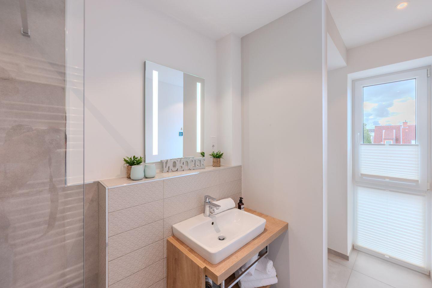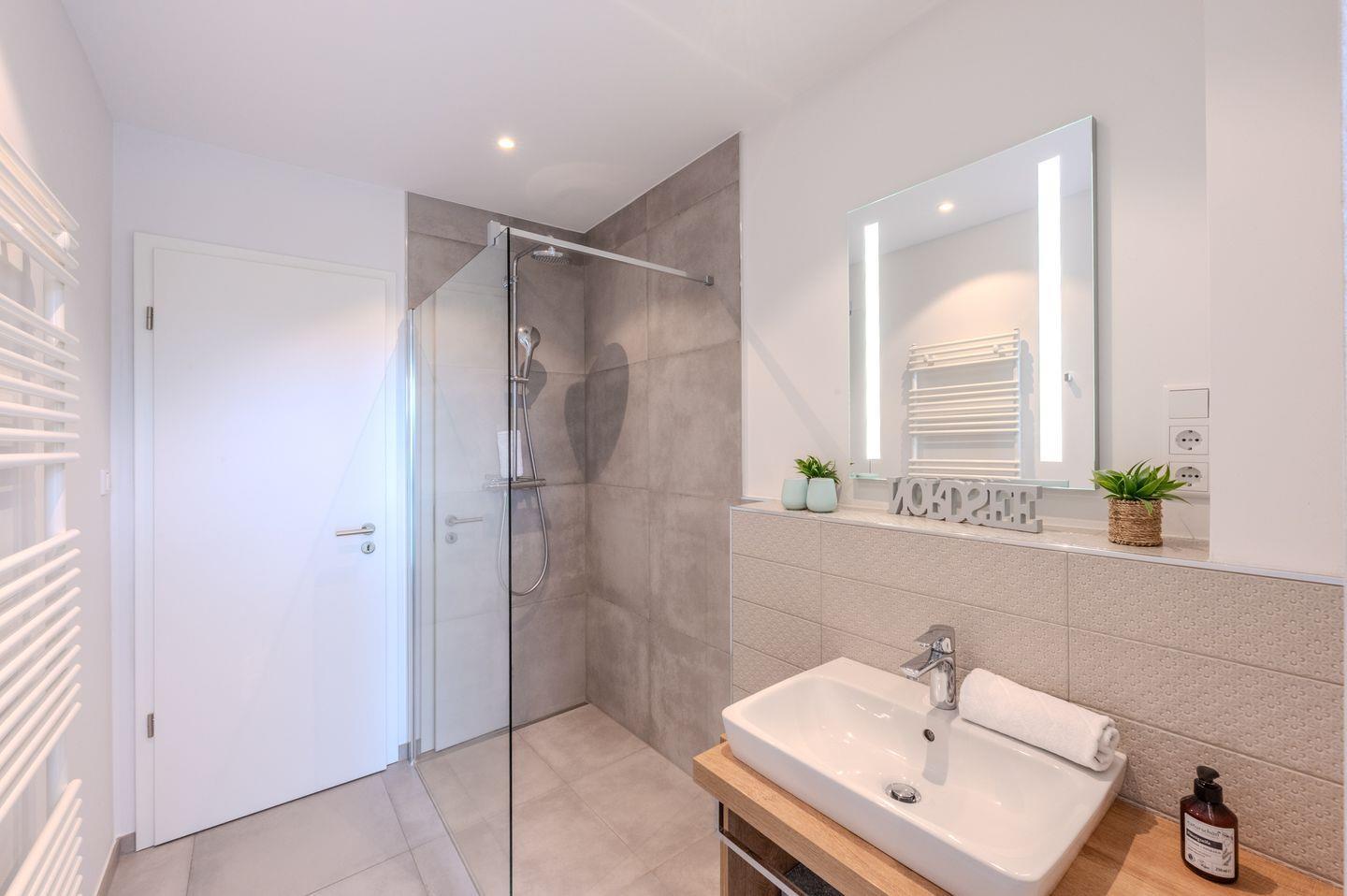 Die Wohnung bietet Ihnen ein Schlafzimmer mit einem gehobenen Doppelpolsterbett (180 x 200) in der Wohnebene: Das großzügige, top-moderne Tageslichtbad verfügt über eine ebenerdige Dusche, ein WC und ein Waschbecken.